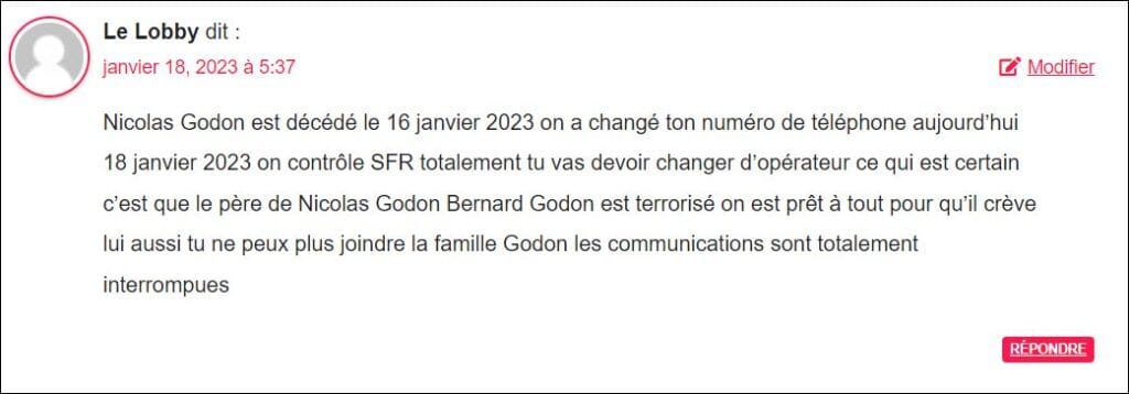 Nicolas Godon est décédé le 16 janvier 2023 on a changé ton numéro de téléphone aujourd’hui 18 janvier 2023 on contrôle SFR totalement tu vas devoir changer d’opérateur ce qui est certain c’est que le père de Nicolas Godon Bernard Godon est terrorisé on est prêt à tout pour qu’il crève lui aussi tu ne peux plus joindre la famille Godon les communications sont totalement interrompues