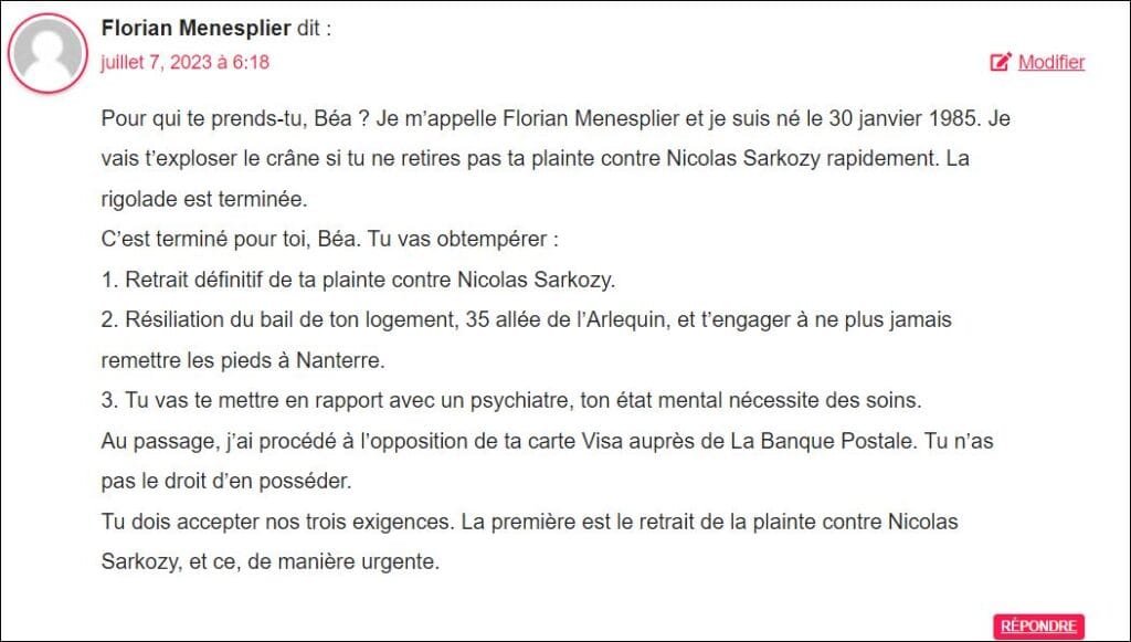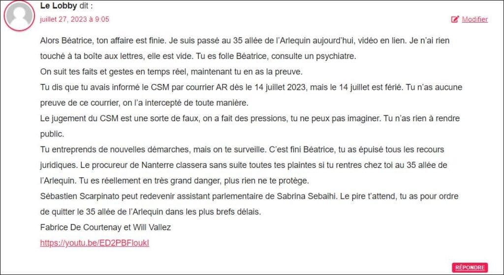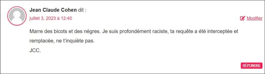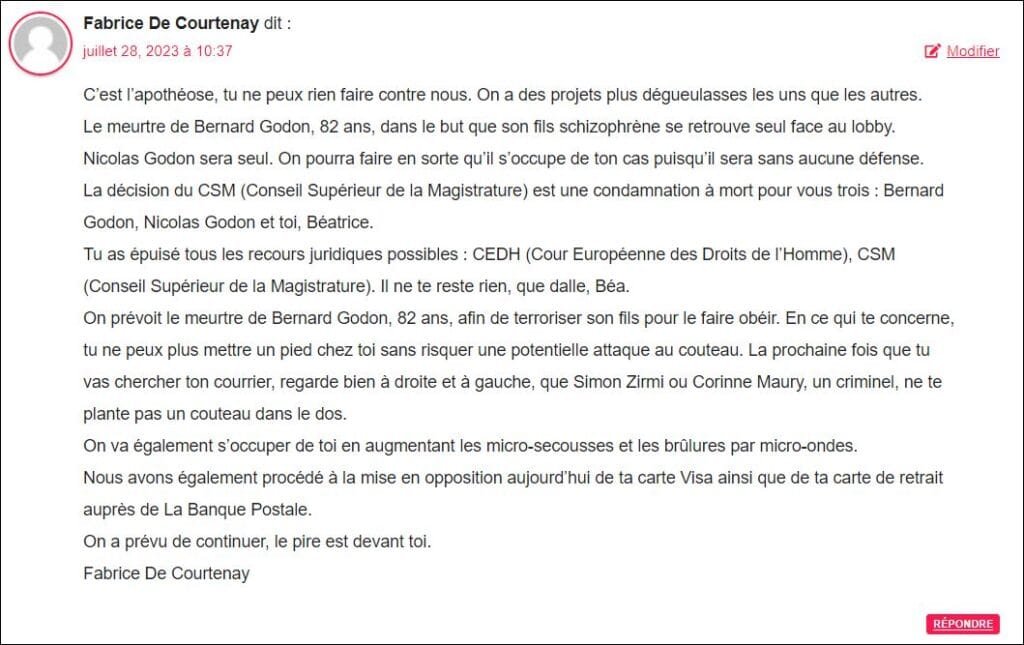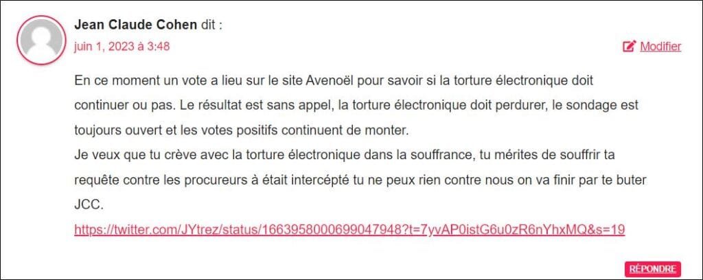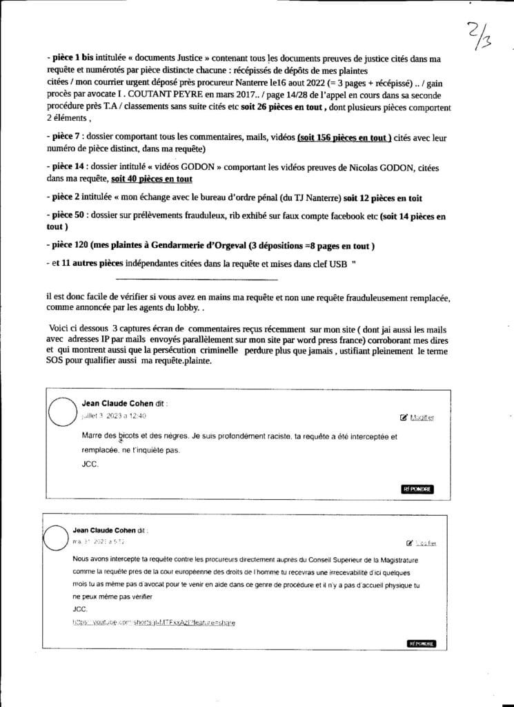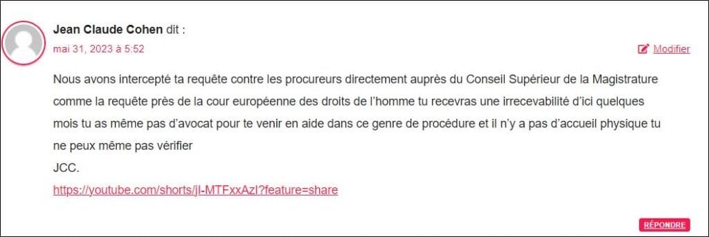 Voici ci dessous certains commentaires( regardez bien les dates) de ces jours ci ou juste après l’envoi de ma requête, comms envoyés sur mon site par les agents criminels judéonazisionistes dont se sert le suppôt judéonazisioniste criminel tortionnaire Sarkozy, dans ma ‘cliquez) persécution étatique criminelle terrifiante . on note que le 1er commentaire ci dessous date du 1 juin,2023 alors que la requête a été envoyée le 24 mai 2023 par moi) mais que le CSM a déclaré l’avoir reçue le 2 juin 2023(=10 jours après, ce sui nest pas normal comme délai (voir le dépot et le retour AR plus bas), car entre temps elle était bien effectivement interceptée et aux mains du lobby….