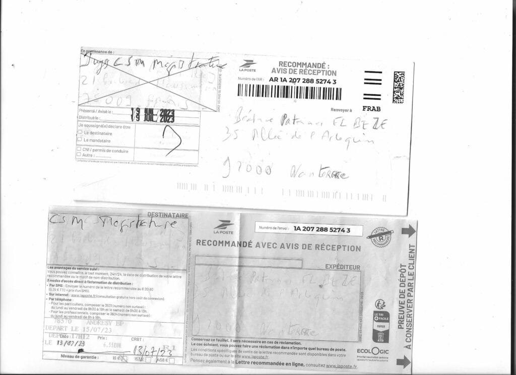 *voir d’abord ci dessous les délais anormaux (qui prouvent l’interception par les dates dépots et les dates retours AR trafiqués dans les dates ) entre les dépots datés et les retours AR datés, pour ma requête CSM comme pour mon courrier de demande de vérification,( le voir plus bas!) de ma requête,( mes mails du 8 et 12 juillet 2023 au CSM ont aussi sans doute été interceptés car anormalement aucune réponse depuis ! ) , puis voir le jugement du CSM plus bas, et au dessous encore ma requête …