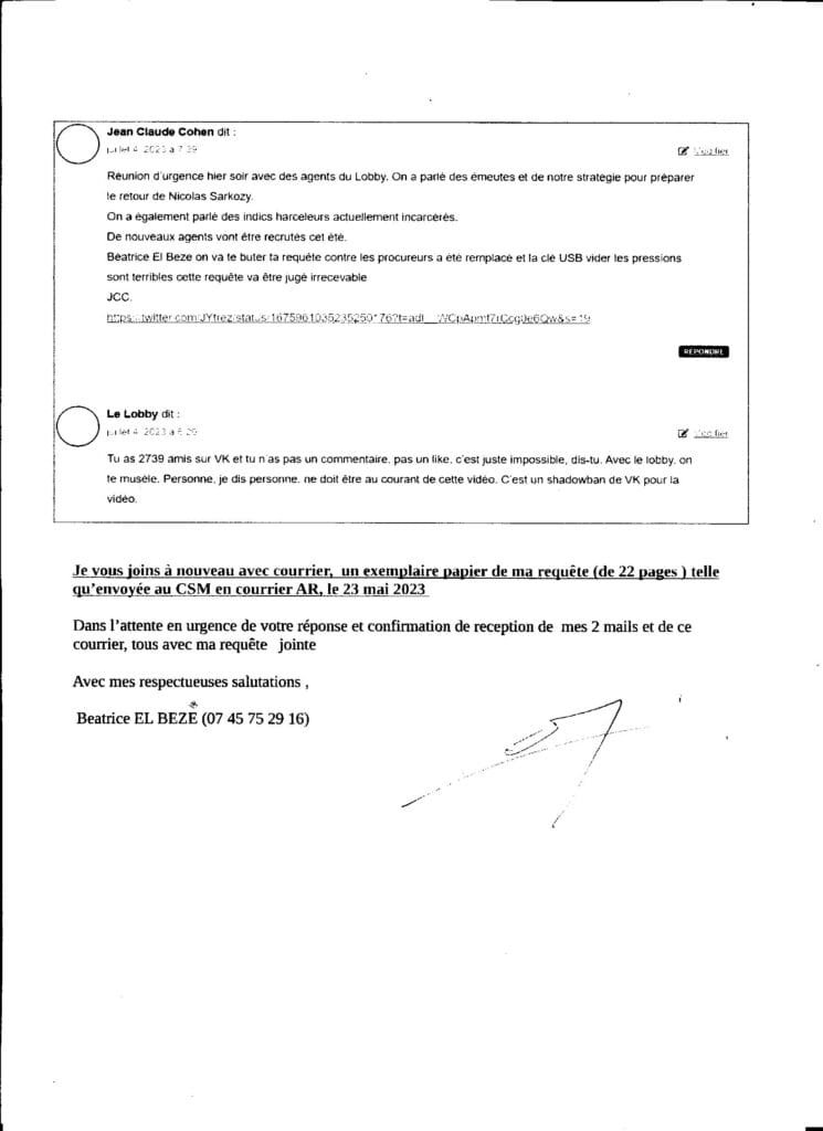 voici ci dessous mon courrier AR envoyé le 13 juill 2023 au CSM(conseil supérieur magistrature pour vérification de la requête transmise ,Sarkozy a alors vite fait envoyer son jugement torchon le 19 juil 2023 et bien sur a fait interceptér mon courrier, auquel il n’y a anormalement aucune réponse !