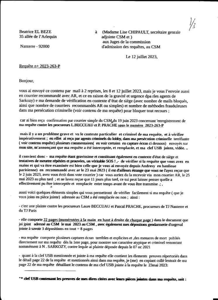 ma requête gravissime près CSM contre les procs Pascal PRACHE et L. BECCUAU interceptée par fraude et remplacée, / et ma seconde requête près CSM du 16 mars 2024, contre les mêmes procureurs, interceptée elle aussi par fraude via SARKOZY et le lobby et remplacée avec des faux documents ! pour me faire passer pour folle