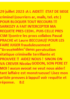 A L’AIDE !!! FAITES FAITES SAVOIR ! PARTAGEZ VITE ! partout où vous pouvez ! et LIRE ABSOLUMENT MA REQUETE PLUBLIÉE TOUT EN BAS!!! (mais requête interceptée par trouille et fraude sur ordres du criminel SARKOZY !) …. ET voir SON JUGEMENT par le CSM qui pue LE FAUX et la rédaction du lobby à plein nez ! …. et voir TOUS LES AUTRES DOCS MIS PLUS BAS !!!! ( doc I COUTANT PEYRE avocate, etc ….car dans cette terrifiante persécution via le fou criminel suppôt du lobby judéonazisioniste SARKOZY il y entre autres (cliquez sur) lhoreur de la torture électronique 24h/24 (pour moi et « criminellement intensifiée actuellement) en « slow kill »= meurtre lent « ) et des tentatives de MEURTRE déjà perpétrées LIRE MA REQUËTE POUR SAVOIR° contre Nicolas GODON, schizophrène, contre son père(82 an s) et contre moi !!!5 Lire ( détails et preuves dans ma requête) voilà ce que cache criminellement ce faux jugement-torchon du CSM (conseil supérieur de la magistrature u 19 juillet 2023 (