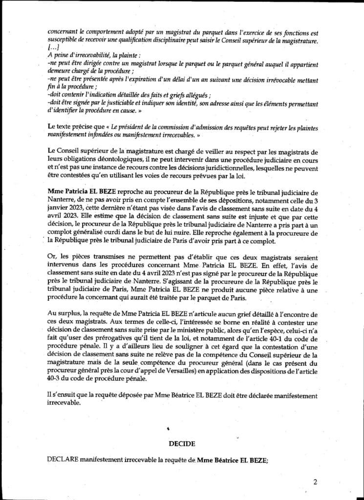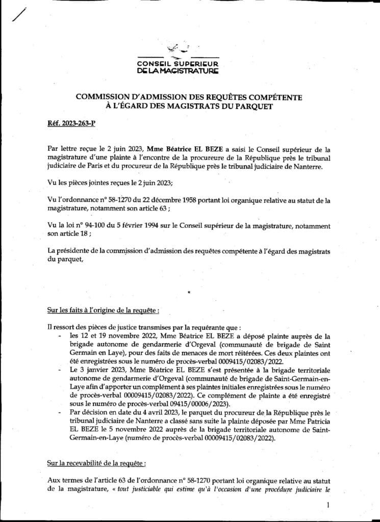 Voici ci dessous le jugement « torchon » par CSM, pour protéger les procureurs collabos aux procédés criminels de Sarkozy et du lobby derrière et qui pue le faux, soit rédigé par le lobby lui même soit réellement rédigé par la présidente de la commission Dominique LOTTIN mais alors d’évidence sur pressions graves du lobby alors, car ‘c’est un jugement ni fait ni à faire, une sorte de faux qui cache toute l’affaire et ne correspond ni au contenu ni à la gravité de ma requête ,et qui est blindé de mensonges, d’erreurs par la présidente de la commission dans les dates de mes dépositions gendarmerie), d’incohérence( ainsi la présidente Mme LOTTIN ne s’inquièterait donc pas du non suivi de (cliquez sur ) mes plaintes gendarmerie pourtant si graves et notamment de la 3ème depuis 7 mois sans traitement malgré l’urgence et le contexte criminel !) preuve qu’elle ne l’a pas eue! en mains alors que transmise avec ma requête) et cynisme, marques du lobby! ainsi le procureur a bien signé le classement sans suite collabo criminel du 4 avril 2023 (voir signature « pr le procureur de la République »= « pour le procureur de la République) « ( voir plus bas le doc preuve) ce qui signifie que le procureur pascal PRACHE est donc engagé dans la signature de son classement sans suite du 4 avril 2023, classement collabo criminel aux procédés criminels de Sarkozy ! car nous laissant sans recours face au pire, malgré l’urgence! et l’absence d’avocat (en raison des pressions) contrairement à ce qui est écrit dans ce jugement CSM) qui prouve à tous niveaux que ma requête n’a pas été instruite ou bien qu’ il s’agit d’une requête remplacée comme annoncé par les pourritures du lobby qui m’ont écrit ‘lavoir remplacée ; il suffit de lire ma requête au conseil supérieur de la magistrature (la voir copiée collée plus bas ou en cliquant ICI) terrifiante et prouvée (avec clef USB jointe à requête) ci dessous pour s’en rendre compte aussitôt ;; quant à ma 3ème déposition complément plainte, du 03 janvier 2023 près gendarmerie, et transmise dès le 04 janvier 2023 au procureur, par gendarmerie, ce jugement de faussaire en parle juste pour dire de façon imbécile qu’elle n’est pas visée par le classement sans suite du procureur pascal PRACHE,( tj nanterre) alors qu’elle est en fait occultée sciemment par ce procureur collabo du pire!) mais tout à fait anormalement la présidente Mme LOTTIN du CSM qui cache aussi le contenu et non traitement de mes plaintes dont celles gravissimes près gendarmerie depuis nov 2022 ne parle pas du non traitement et blocage enquête de cette 3ème plainte aussi près gendarmerie, du 03 janv 2023, ni ne parle nulle part des GODON père ou fils !!! cités pourtant partout dans ma requête (la voir en bas) et dès le début ,comme étant en danger de mort, ni ne parle de leur plainte près gendarmerie de Chelles que j’ai citée, faite le 1er déc 2022 ave complément le 21 déc 2022 et bloquée depuis criminellement par la procureure collabo du pire, de Paris Laure BECCUAU, plainte terrible pourtant et confirmant les miennes et notifiée dans cette 3ème déposition), ni ne parle de ‘l’instrumentalisation criminelle depuis oct 2021 contre nicolas GODON schizophrène pour qu’il me tue, ni ne parle du blocage depuis 7 mois aussi de cette 3ème déposition restée criminellement sans enquête, comme celles de nov 2022, malgré la poursuite – notifiée et assortie de preuves terribles à l’appui dans la clef USB jointe à ma requête – du harcèlement criminel incessant sur moi et sur les GODON, père et fils, ni ne parle des faux prélèvements sur mon compte, de l’utilisation frauduleuse de mon rib et des fausses chaines et fausses vidéos qui pour me salir gravement, et salir mon père, et qui tous se poursuivent ni ne parle du retour faux Samu dont je suis toujours menacée en boucle parles agents criminels (protégés en justice par procs collabos criminels cités) de Sarkozy si je rentre chez moi, ni des des faux médicaux (fausse tumeur, cancéreuse cérébrale, faux avc) faits et (cliquez sur) objets de plainte depuis mai 2022 de ma part (= depuis 16 mois déjà , or suis en vie, sans aucun soin, alors que je devais crever soi disant vers aout 2022 (= depuis un :an donc !..) cause de ma (fausse) tumeur, preuve que ce sont des faux médicaux criminels! sur ordres de Sarkozy ,), ni ne parle des tentatives de meurtre répétées perpétrées sur N GODON et à nouveau fin juin 2023 notamment tentative de noyade par l’agent criminel jean claude Cohen, agent de Sarkozy )…. étonnant nest ce pas??? …,mais surtout C’EST LA PREUVE PAR MILLE ! que cette présidente Mme Dominique OTTIN n’a pas jugé ma requête ci dessous(et ne l’a jamais eue en mains) car tout y était notifiée clairement preuves à l’appui en clef usb, et peut être n’est ce même pas elle non plus qui a écrit ce torchon débile de jugement particulièrement mal fait et qui pue le faux et le lobby, car ma requête est manifestement et nécéssairement recevable !l car terrifiante et la collaboration aux procédés criminels de Sarkozy et du lobby par les procureurs cités Laure BECCUAU et Pascal PRACHE (qui bloquent criminellement nos plaintes gendarmerie depuis nov 2022 et bloquent ,toute enquête) malgré l’urgence et la criminalité des faits et danger du pire,) ,est prouvée haut la main dans ma requête , je suis donc légitimée à dire que ce jugement scandaleux constitue une « NON ASSISTANCE DELIBEREE A PERSONNE S(3!) EN DANGER, MISE EN DANGER DELIBEREE D’AUTRUI (sur 3 personnes) ET ASSOCIATION DE MALFAITEURS » , PAR LA PRESIDENTE DE LA COMMISSION D’ADMISSION CSM, Mme LOTTIN. je ne vais donc pas laisser les choses en l’état et entre autres démarches suis légitimée en contexte à porter plainte contre cette Mme Dominique LOTTIN avec ces qualifications pénales. citées ci 