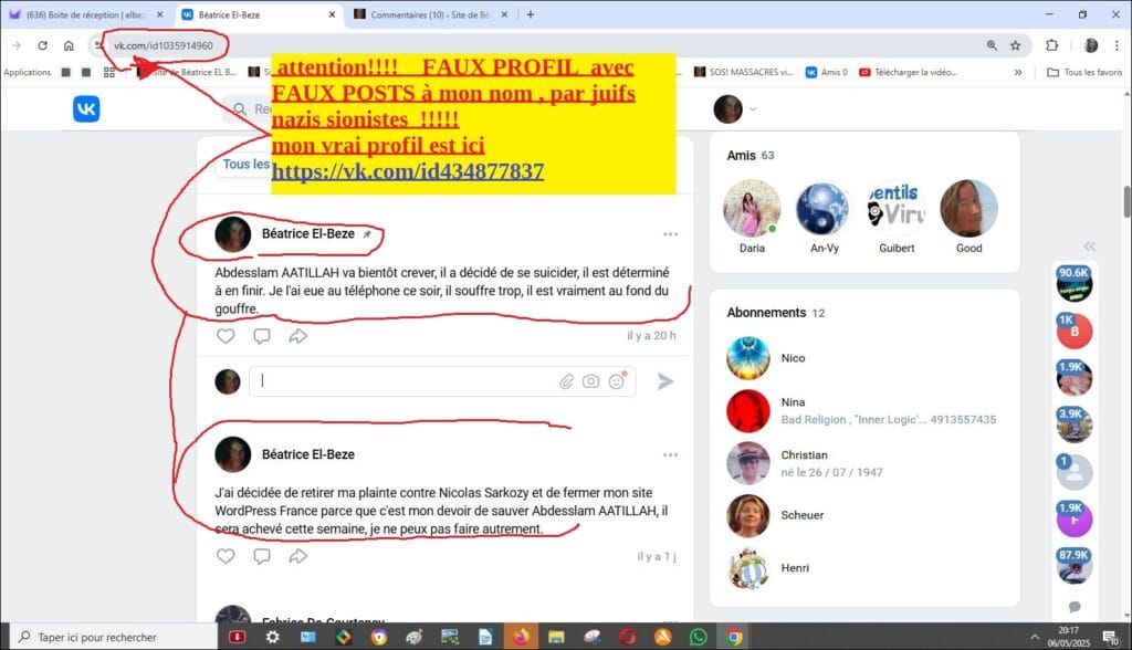 AIDEZ MOI AU MOINS EN FAISANT SAVOIR ! :!! (voir Preuves sur ma page vK ici (( attention page sabotée par vk france descendre curseur a droite pour remonter ma page: , attention faux profil à mon nom ici cliquez ici ,(laissé en place illégalement par site collabo criminel aux ordres du lobby VK france) descendre curseur pour remonter la page) voir mon compte tweeter quasi shadowban avec tous les liens bloqués par ce site collabo criminel X,,:https://x.com/BeatriceELBEZEet !!!! et faux profil Xfrance avec ususrpaion d emon identité ici