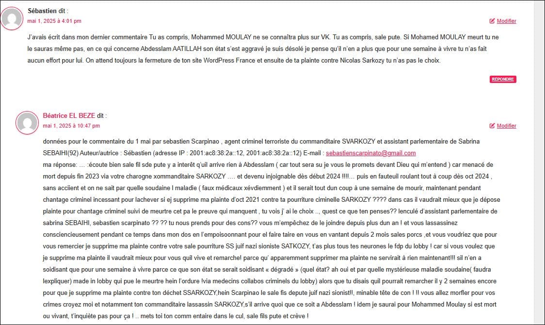 Sébastien dit : « Comme promis Mohammed MOULAY ne se connecte plus tu peux l’oublier on va buter Abdesslam AATILLAH depuis que son état de santé s’est aggravé on attend la fermeture de ton site WordPress France en URGENCE c’est sûr la semaine prochaine il ne sera plus de ce monde ne te raconte pas d’histoire El Beze il est entre les mains des médecins collabos du lobby on a buté ton père je te donne un lien souvenir tu n’as rien pu faire pour le sauver ne te berce pas d’illusion c’est autour de Abdesslam AATILLAH de mourir tu devrais fermer ton site WordPress France pour essayer de lui sauver la vie, et n’oublie pas de retirer ta plainte contre Nicolas SarkozyTu n’as pas le temps de déposer plainte pour chantage criminel il ne reste que trop peu de temps à vivre, tu peux parler de meurtre mais tu es trop conne on va faire une autopsie made in lobby ça sera une mort naturelle Tu as vu tu ne peux rien faire pour fermer le compte X (anciennement Twitter) à ton nom, c’est une poubelle là-bas tu es complètement shadoban, je vais me faire blanchir sur Xhttps://www.deces-en-france.fr/resultats/20828016-el-beze-jean-claude-rozmim
