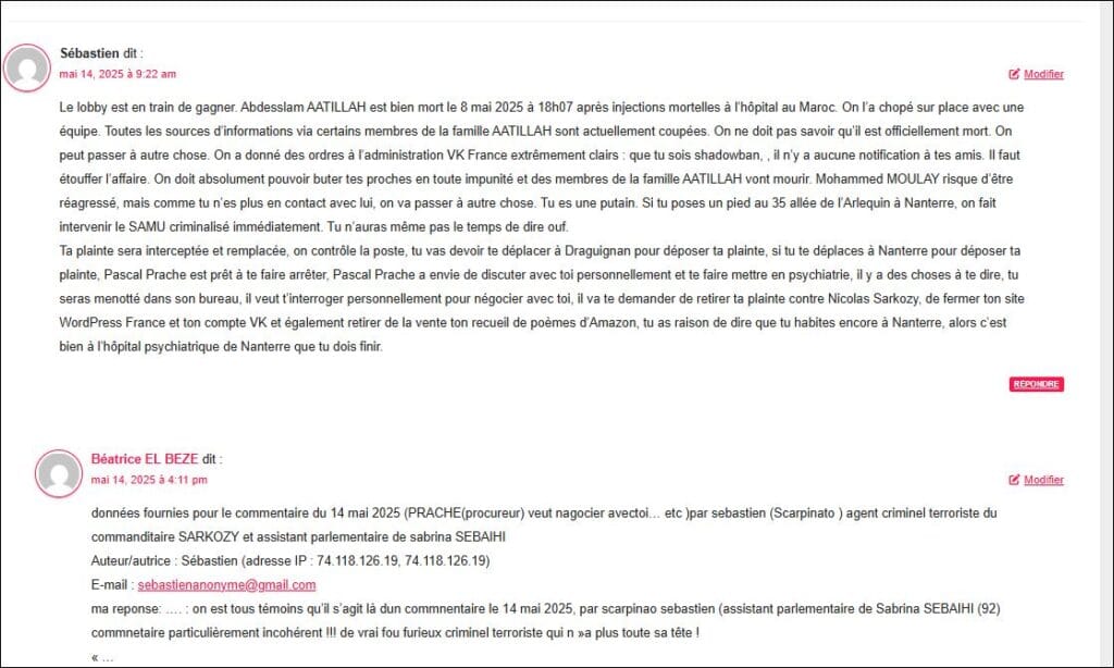 T’as vu le lien, Demain, 7 mai 2025, on va lui faire une première injection de neurotoxiques à fortes doses pour le faire sombrer doucement. Tu n’as pas le choix de fermer ton site WordPress France et retirer ta plainte contre Nicolas Sarkozy. Alors écoute bien, si le 7 mai dans l’après-midi tu n’as pas fait une vidéo pour déclarer que tu vas fermer ton site et retirer ta plainte contre Nicolas Sarkozy, alors Abdesslam AATILLAH sera achevé. Ça va durer plusieurs jours, une série d’injections mortelles grâce à des faux médicaux. Merci les médecins.