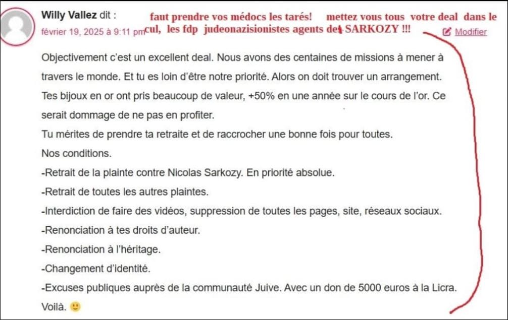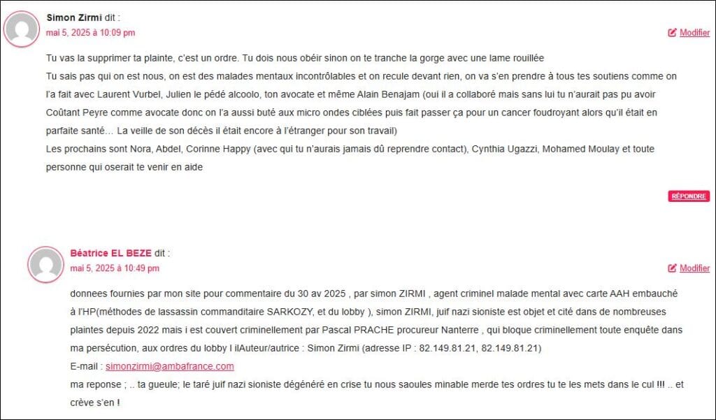 - Béatrice EL BEZE dit :Modifierdonnees fournies par mon site pour commentaire du 37 mai 2025 , 2025 , par simon ZIRMI , agent criminel malade mental avec carte AAH embauché à l’HP(méthodes de lassassin commanditaire SARKOZY, et du lobby ), simon ZIRMI, juif nazi sioniste est objet et cité dans de nombreuses plaintes depuis 2022 mais i est couvert criminellement par Pascal PRACHE procureur Nanterre , qui bloque criminellement toute enquête dans ma persécution, aux ordres du lobby / r/autrice : Simon Zirmi (adresse IP : 176.53.177.37, 176.53.177.37)