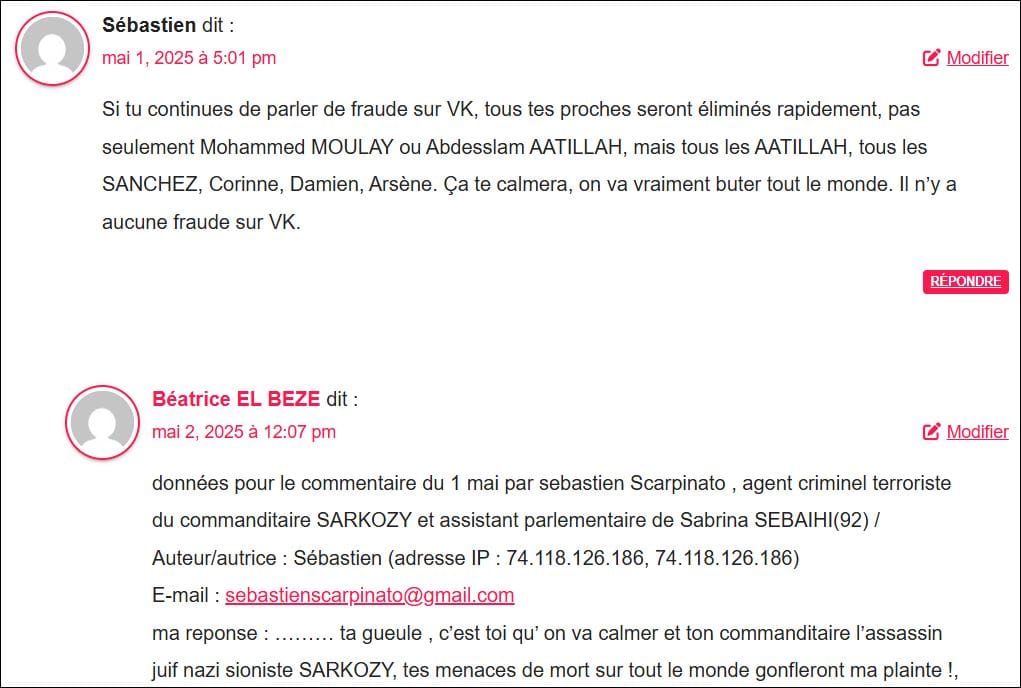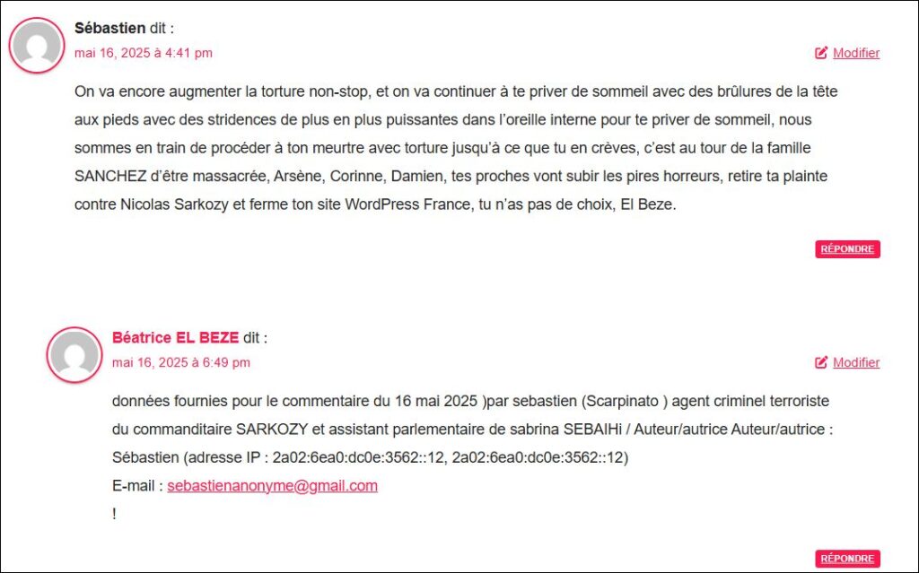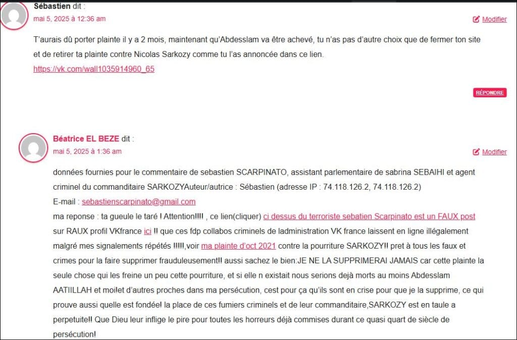 données fournies pour le second commentaire du 8 mai 2025 (.. décédé ) par sebastien (Scarpinato ) agent criminel terroriste du commanditaire SARKOZY et assistant parlementaire de sabrina SEBAIHI (92) : / Auteur/autrice : Sébastien (adresse IP : 74.118.126.186, 74.118.126.186) E-mail : sebastienscarpinato@gmail.com