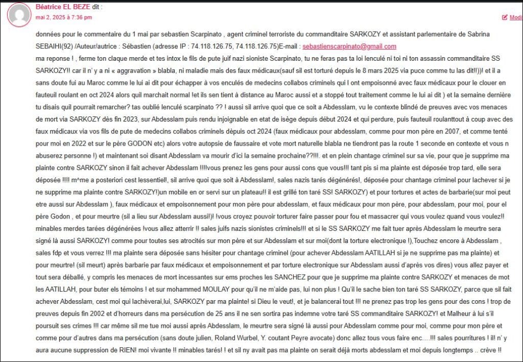 Béatrice EL BEZE dit :Modifierdonnées fournies pour le commentaire du 7 mai 2025 (par sebastiens Scarpinao ( sur injections mortelles etc ) par sebastien (Scarpinato ) agent criminel terroriste du commanditaire SARKOZY et assistant parlementaire de sabrina SEBAIHI (92) : Auteur/autrice : Sébastien (adresse IP : 45.83.126.4, 45.83.126.4)