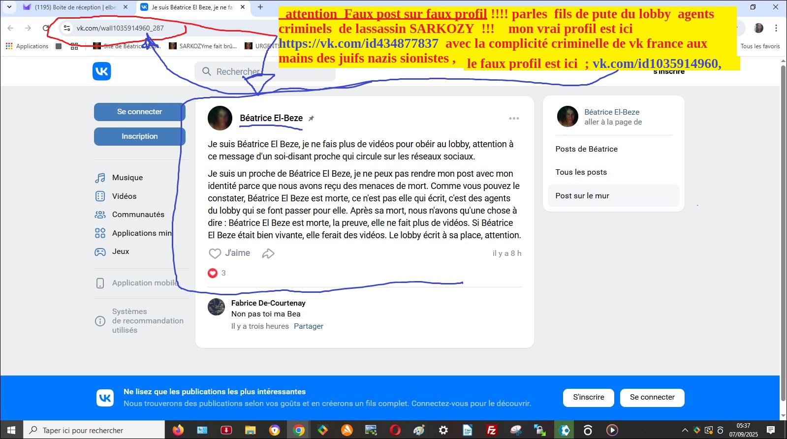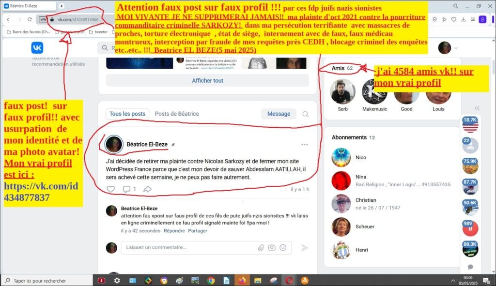 5 mai 2025…….ATTENTION !!!!!!! FAUX POST sur FAUX profil (ici https://vk.com/pbeatriceelbeze) de ce soir par les fdp juifs nazis sionistes pour faire croire que je vais supprimer ma plainte ,!!! alors que QUE JE NE LA SUPPRIMERAI JAMAIS !!!! c’est la seule chose qui nous protège un peu sinon nous serions déjà morts depuis longtemps Abdesslam et moi,!!!! et possiblement d’autres de nos proches menacés ( les AATILLAH, les SANCHEZ , Mohammed MOULAY, /etc..) de mort aussi par ces fassassins du lobby via commanditaire SARKOZY pour que je supprime ma plainte contre lassassin SARKOZY d’oct 2021 , avec ces deux vidéos 1/2 et 2/2) ou ici sur mon site avec documents scannerisés(cliquez sur)ma plainte contre SARKOZY d »oct 2021