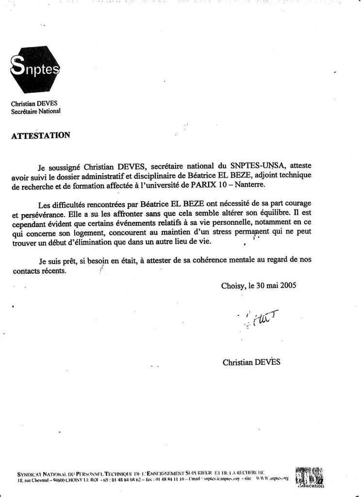 attestation ci dessous, en juillet 2006, par le même Christian DEVES, secrétaire national du SNPTES.. qui a dormi à mon logement F2 actuel (lors des réunions mensuelles du syndicat SNPTES) à ma demande en 2006, en raison des graves méthodes menées à mon encontre .. ( voir plus bas les documents preuves par fatima Magani du harcèlement nocturne sonore subi dès fin 2002 à st Cloud, via la police