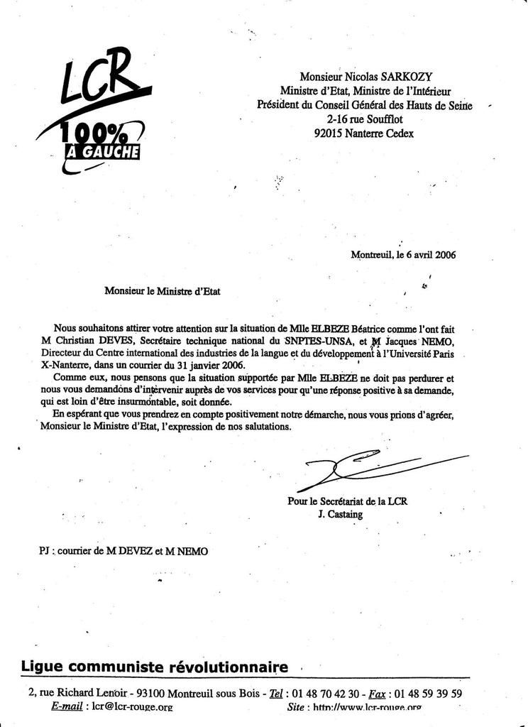 courrier de la LCR … adressé à Nicolas SARKOZY en 2006, en mon soutien …. mais dès 2007, l’affaire s’aggravant criminellement jusque sur mon père,(coir lien l’ affaire) terrifiée , me suis rendue à la LCR à Montreuil pour demander de laide, et devant entre autres Krivine , et Besancenot dans une salle , leur ai dit , ils tuent les miens , mon père .. aidez moi je vous en supplie !….. mais alors qu’un second courrier devait être fait, m’avait dit au tlé le secrétaire de la LCR les semaines pécédetes , ion m’a fait sortir par un gars sur place . sans un mot ;d’explication .. c’était entre les deux tours avant l’élection de Sarkozy et la peur (de ses méthodes crimienlles) était palpable et régnait déjà….