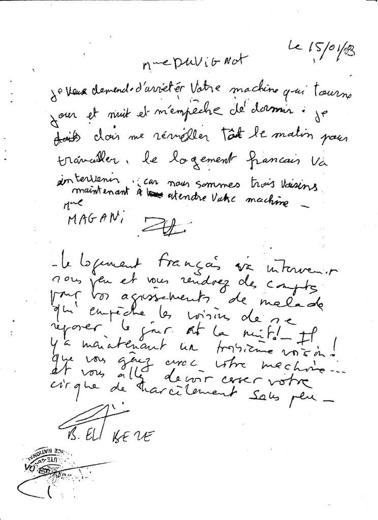 … et a été harcelée en même temps que moi dès le 25 nov 2002 (la date est citée par F. MAGANI dans son écrit = juste après mon dernier courrier politique publié dans JAL)...et durant plus d’un an (nous habitions deux studios co mitoyens, dans le même bâtiment où se situent les locaux de la police de Saint Cloud, au 27 Dailly ) et contraintes toutes deux de déménager début 2004..) ; nous ne connaissions pas le « harcèlement électronique » et nous pensions à une sorte de machine tournant à vide.. Mme Morel à laquelle s’adresse F. Magani, était la directrice du service hygiène et sécurité à la mairie de Saint Cloud en 2003 .et le Logement Français, notre bailleur.. Fatima. MAGANI s »était plainte en outre dans une main courante au commissariat de St Cloud, de propos racistes à son encontre .sur place ..par certain voisinage. logée au dessous de chez moi ..et « Mme DUVIGNOT » à qui elle s’adresse,était une voisine (travaillant dans les services de police) logée juste au dessus de chez moi ,me harcelant et protégée par le commissariat..