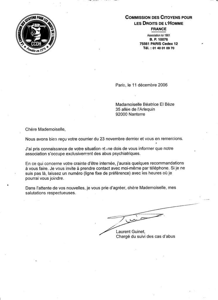 ci dessous courrier de fin déc 2006 par laurent GUINET membre du CCDH ,( dont le président est Pierre Grosmann (issu de la communauté juive comme moi ) , et il m’appelera durant 6 h fin déc au tél , e t me dira à ma grande surprise .. « d’aller voir le rabbin de Nanterre , pour demander et en ces termes précis m’a til dit , « à réparer pour mes écrits » ( politiques publiés en 2002, génèse de l’affaire ); laurent Guinet était au courant de la situation de grave danger pour mon père aussi(fait passé pour fou avec mensonges ignobles en sept 2006.) .. j’irai voir le 31 déc 2006, le rabbin de Nanterre pour tenter de sauver mon père alors maintenu contre son gré dans un établissement médical (alors que simplement myopathe depuis des années, mais très intelligent ), mais ça ne servira à rien , le rabbin était froid et dur, sans empathie aucune et certainement briffé sur mon affaire avant le rdv .. .