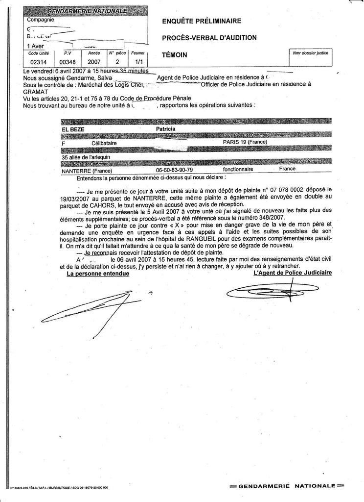 ci dessous ma plainte avec partie civile dès 2OO7 pour « mise en danger grave d la vie de mon père » …. et mes dépositions successives à la gendarmerie de ( ).. entre avril et mai 2007, ( toutes mes dépositions et celle de ma tante à la même gendarmerie, ont été occultées sciemment dans le non lieu du juge gravement corrompu et collabo Yves Ravallec dans ma plainte pour « mise danger grave de la vie d e mon père » …et la copie de la déposition de ma tante ne lui a anormalement pas été donnée .(ai caché les noms de la ville sur demande mes oncles et tante ( maternels, non juifs, et en conflit avec ma mère )pour leur sécurité..)