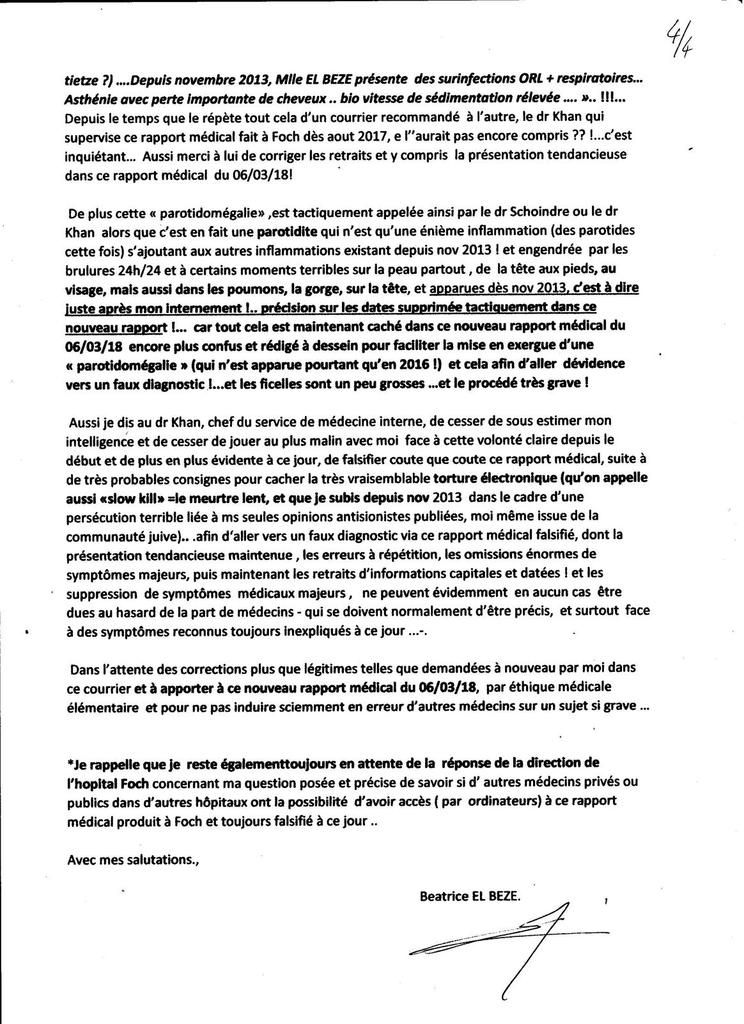 Ci dessous mon courrier AR de mars 2018 où je dénonce clairement et détails à l’appui la énième nouvelle falsification énorme opérée tactiquement via le docteur Emmanuel Khan, directeur médecin interne Foch (issu là encore de la communauté juive comme moi,) … et où je demande des corrections pour faire cesser ce cirque de faussaire du lobby, par le docteur KHAN !, pour cacher d’évidence la torture électronique à tout prix en trafiquant tout !…..Lisez ce courrier que je lui adresse, car c’est de la part de ce dr E. KHAN, un travail étudié de faussaire du lobby !…mais ces falsifications acharnées et à répétitions ne font que confirmer la réalité de torture électronique ! (sinon pourquoi ce soin pris pour falsifier ainsi à répétitions le rapport médical et ma symptomatologie ?? !!!!) et ces falsifications supervisées par le Dr Khan(issu comme moi de la communauté juive comme par hasard.) prouvent aussi que la torture électronique est bel et bien une arme aux mains du lobby judéonazisioniste !..et couvertes par ses sayanims!