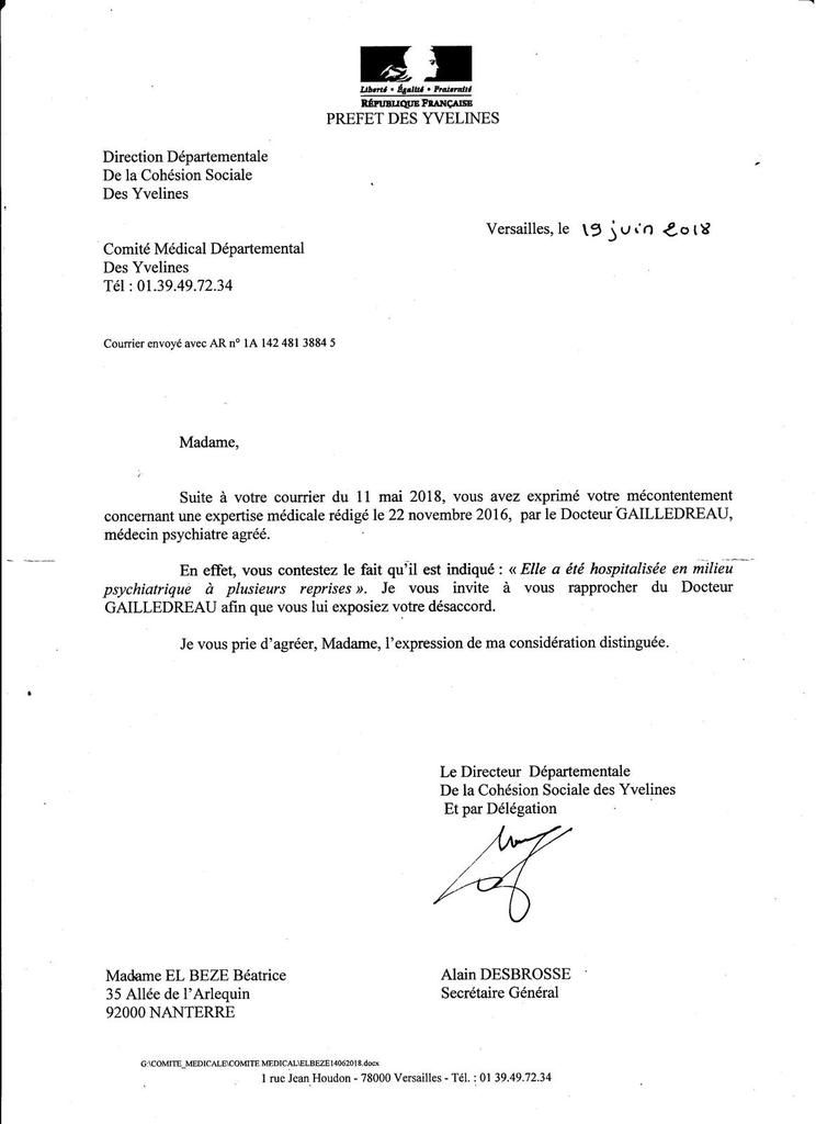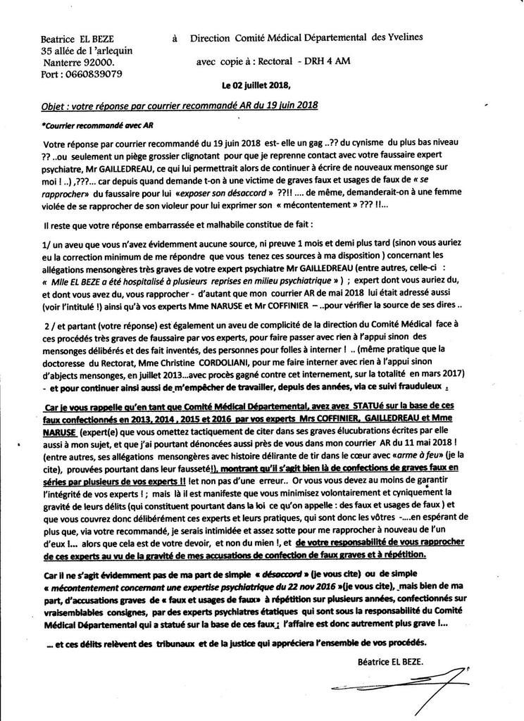 et voici ci dessous ma réponse cinglante le 02 juillet 2018 en recommandé AR au Comité Départemental , face aux faux et suage des faux à répétition par ses experts psychiatres ! ….parce que je veux bien qu’on me prenne pour une imbécile, mais il ya des limites au cynisme !