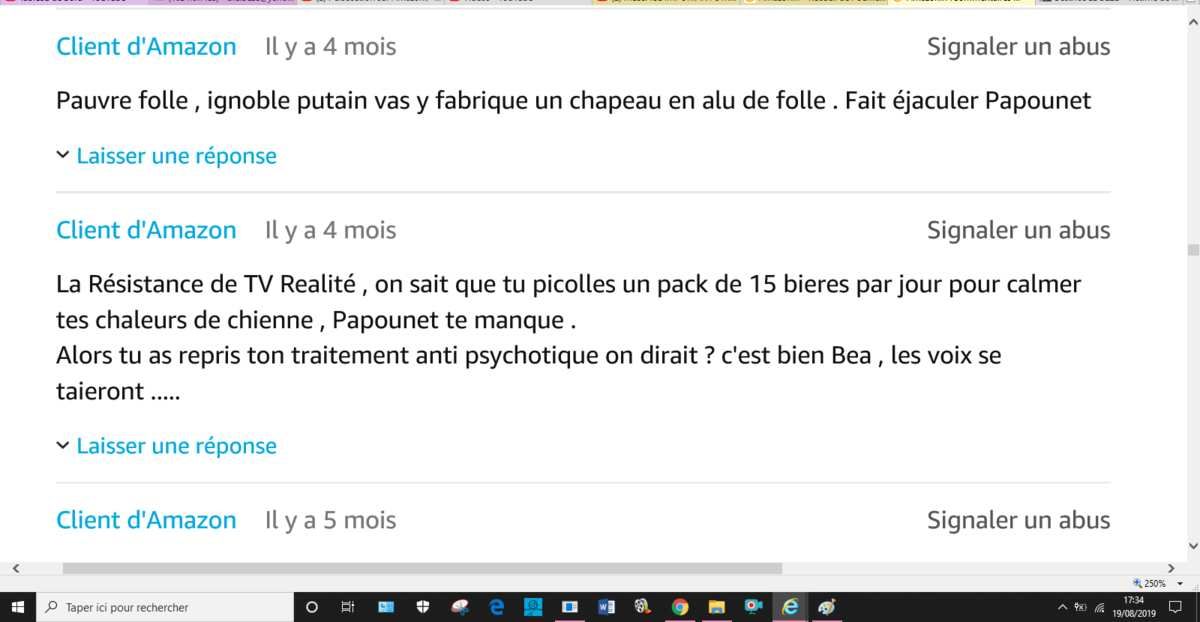 …puis 3 mois après dès le 11 fév 2019 , un troll judéonazisioniste en mission, apparait pour me diffamer très gravement avec son 1er commentaire puant intitulé « livre de fou » ( suivi de plusieurs autres ignobles, voir ma page Amazone) et en prenant en plus en pseudos, les prénoms de mon père décédé,, grave victime du lobby !) et en me salissant et en m »accusant sans rien à l’appui de plagiat ! de folle, et autres « saloperies » bien représentatives du lobby .. .puis c’est un torrent d’obscénités délirantes sur mon père et moi publiquement ! (voir tous les commentaires en cliquant sur le. lien vers page de vente sur Amazone (cliquer) ICI …Exemples ci dessous