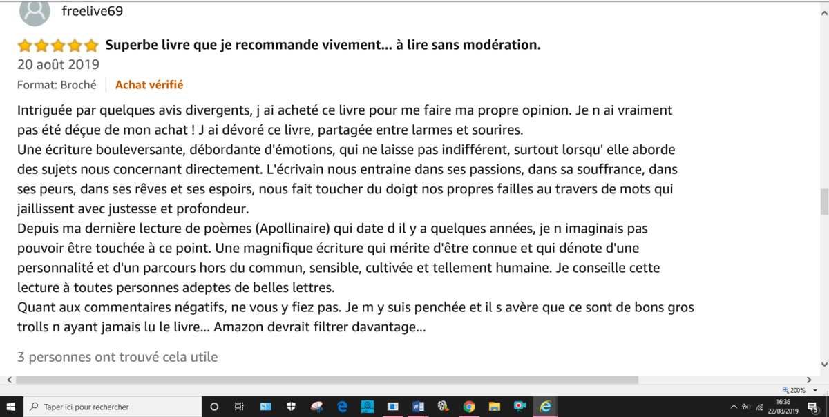 ainsi voici la teneur de quelques commentaires positifs (les voir tous sur Amazone ) ,qui étaient déjà tous hyper élogieux avant le 11 fév 2019, donc mon livre était classé dans premières ventes en poésie . donc lobby judéonazisioniste( =Sarkozy and Co) en panique, car mon talent aide et aidera même après ma mort à faire connaitre davantage mon affaire , ce qui fait peur au lobby, un recuiil survivant à la mort de l’auteur , surtout quand il est aussi apprécié ..