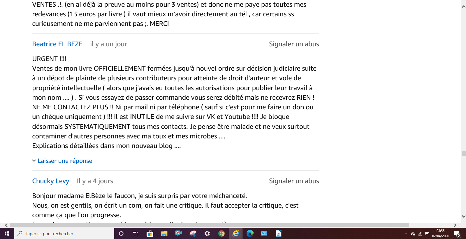 AINSI VOICI cidessous LA CAPTURE D ECRAN DE CERTAINS DE CES COMMENTAIRES GRAVEMENT DIFFAMATOIRES FAITS AVEC USURPATION D E MON IDENTITÉ !!! depuis nov 2019 et EN CORE EN AVRIL 2020 ! (alors que le procureur est au courant dpeusi nov 2019 !!!) attention je n’ai pas le coronavirus ! , et il n’y a évidemment aucun plagiat sinon mon livre ne serait plus en vente ! or il l’est toujours !