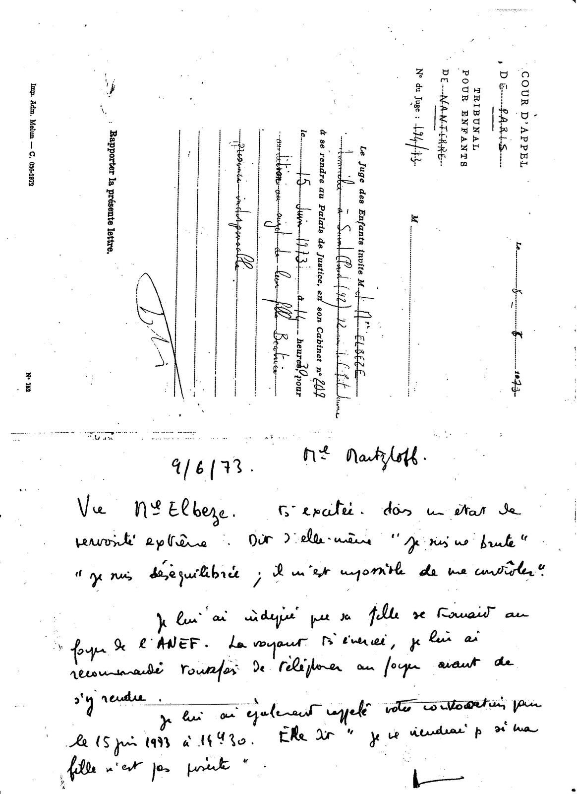 .attention!!! documents cidessous falsifiés en 2006 sur feu vert de Sarkozy! ..avec inversion des rôles opérée par la clique de sarkozy dès 2006, avec un exemple extrait et falsifié de l’enquête sociale de 1973 (comportant10 feuilles) faux vraisemblablement concoctés en 2006 par une petite ordure judéonazisioniste sur consignes du lobby , avec comme fil conducteur en leitmotiv les termes récurrents « violent, très violent » (= comportement dangereux.. le document est intitulé « comportement « , (en haut à gauche) , mensonges avec strictement rien à l’appui comme incident ou paroles cités en exemple !!!!, comme d’hab dans mon affaire ! ….. assortis d’une fiction insipide et d’un discours imbécile tel entre autres « leur reprochant leur fermeture aux problèmes des jeunes » (!) écrit pour occulter la réalité grave dans mon enfance et minimiser ainsi les raisons de la procédure en justice dans mon enfance ; ces termes (« violent, très violent ») oont été mis tactiquement lors de la réécriture, dans la bouche de tous les intervenants (père, mère,etc..). pour accréditer le mensonge sur ma future soidisant « dangerosité actuelle »… or je n’étais absolument pas violente et à aucun niveaux dans mon enfance et adolescence mais plutot terrorisée et victime depuis l’enfance de violence physique récurrente par ma mère (voir doc au dessus) …mais pour tenter de me faire interner par ma mère dès 2006 (et faire ainsi d’une affaire poltique une affaire qui serait juste « familiale « /lire toute l’affaire dans lien en haut de page, pour bien comprendre) il fallait dès 2006 rétablir les droits parentaux de ma mère…. et donc faire passer la victime pour coupable.. en réécrivant ces documents officiels anciens (d »où ma plainte avec partie civile pour « falisification de documents officiels en justice »). (Je ne mettrai pas les attestations de mes oncles et tante à l’appui de mes dires et portées dans ma plainte, car elles révèlent trop de choses de la vie privée de ma famille, bien assez étalée et offerte en pature par toutes ces monstrueuses méthodes dans mon affaire.)
