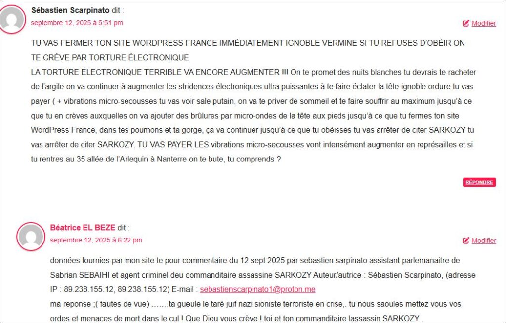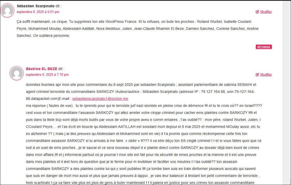 données fournies par mon site te pour commentaire du 12 sept 2025 par sebastien sarpinato assistant parlemanaitre de Sabrina SEBAIHI et agent criminel deu commanditaire assassine SARKOZY Auteur/autrice : Sébastien Scarpinato, (adresse IP : 89.238.155.12, 89.238.155.12) E-mail : sebastienscarpinato1@proton.me