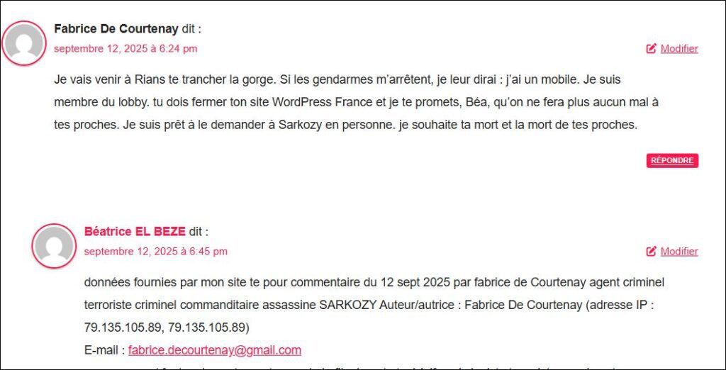 Je vais venir à Rians te trancher la gorge. Si les gendarmes m’arrêtent, je leur dirai : j’ai un mobile. Je suis membre du lobby. tu dois fermer ton site WordPress France et je te promets, Béa, qu’on ne fera plus aucun mal à tes proches. Je suis prêt à le demander à Sarkozy en personne. je souhaite ta mort et la mort de tes proches.