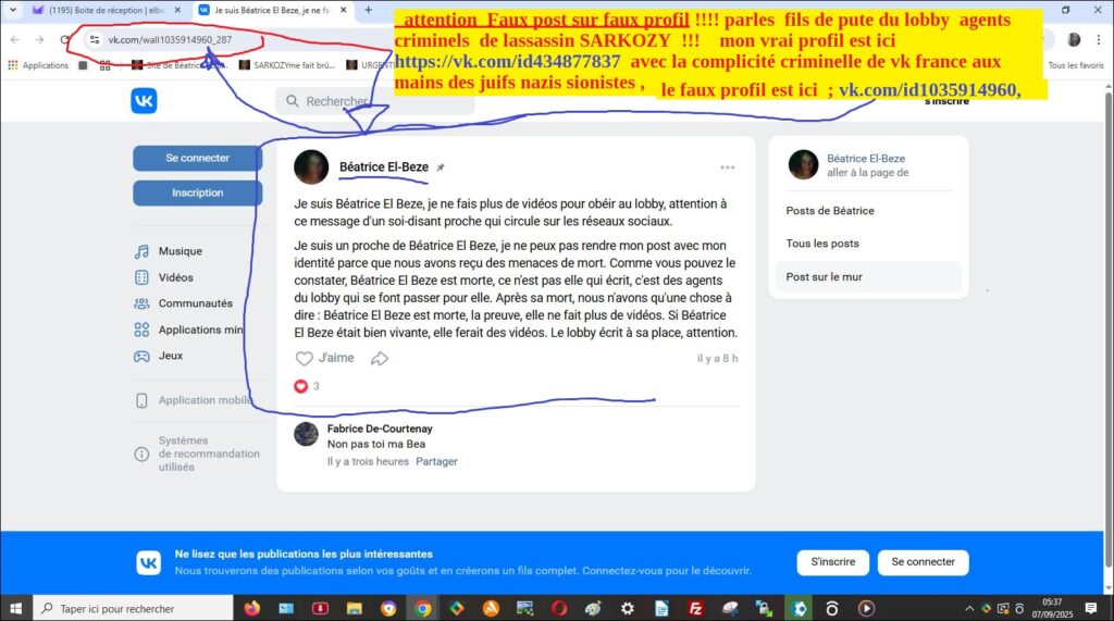 URGENT!!!! Il y a crées par les fdp agents du fdp SARKOZY assassin commanditaire, plusieurs FAUX PROFILS A MON NOM , LES VOIR ici ; vk.com/id1035914960, et là vk.com/beatriceelbeze et là: https://vk.com/pbeatriceelbeze AVEC FAUX POSTS les agents criminels juifs nazis sionistes de SARKOZY !) àvec usurpation identité et de ma photo avatar avec FAUX POSTS délirants à mon nom i!!!!.avec la collaboration criminelle de ladministration de vkfrance,qui refuse illégalement de les supprimer malgré signalements repétés:!!!,
