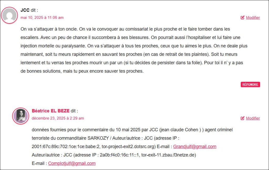 et le jour de Noel, 24 déc 2025, commetaire du lobby , enrage ‘ » on parlera après ta mort, on dira ce qu »on veut et )personne ne saura que ce nest pas toi ..) + menaces d’interenement (avec faux médicaux, méthode du fFDP SARKOZY) par cet étron cinglé, alors que je continue de payer mon loyer à Nanterre, tous les mois !!! mais le procureur (collabo) criminel Yves BADORC bloque toute enquête ma plainte de sept 2024 pour couvrir ces étrons juifs nazis et leur commanditaire lassassin SARKOZY , pour m êmpêcher criminellement de mettre un pied chez moi depuis ! même pour récupérer mes affaires un maffai juive nazie couverte en justice