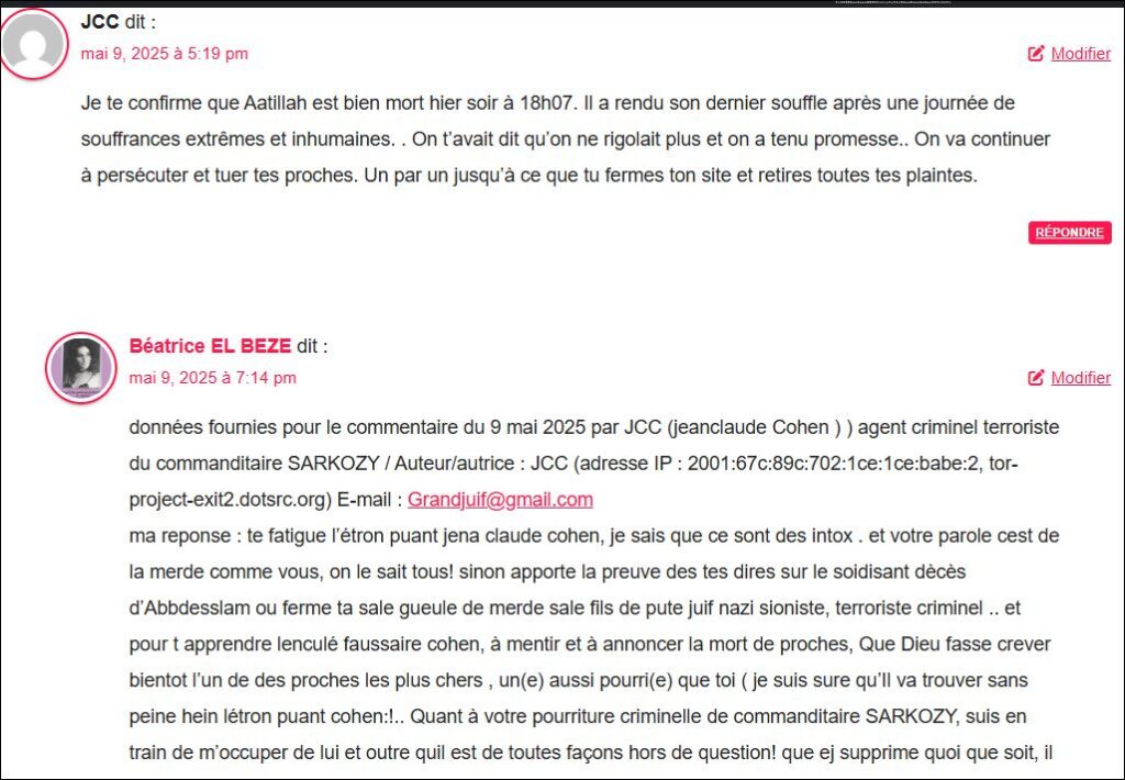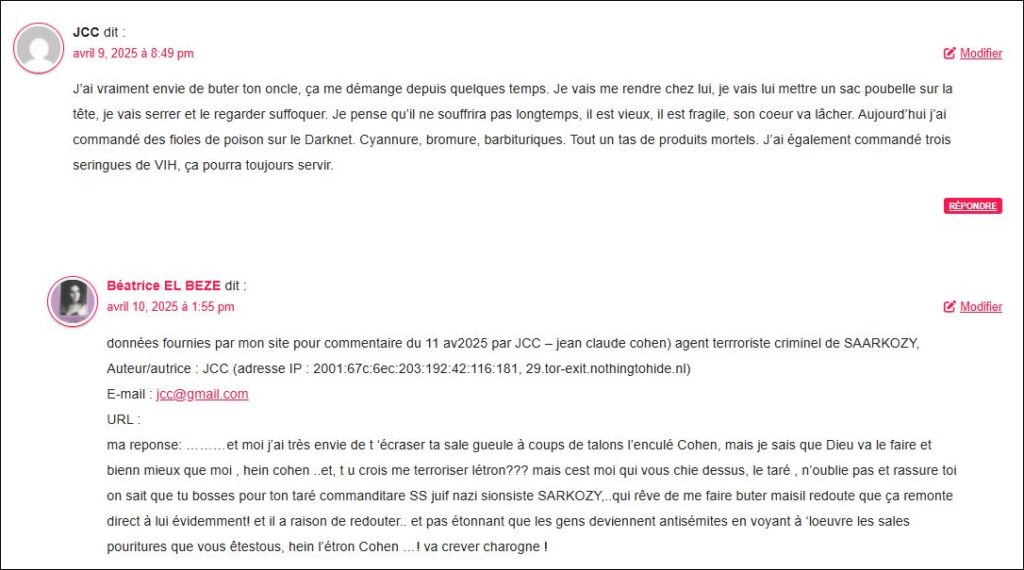 ci dessous dans on commetaire du 9 avr 2025, le lire : « …jai envie de buter ton oncle .. ça me démange .. je vais me rednre chez lui, lui mettre uns ac cpoubelle sur la tête et ej vasi serrer et et el regarder suffoquer .. » cest ç les cpians de la pouriure SARKOZY ! les cinglés vont aux cinglés …