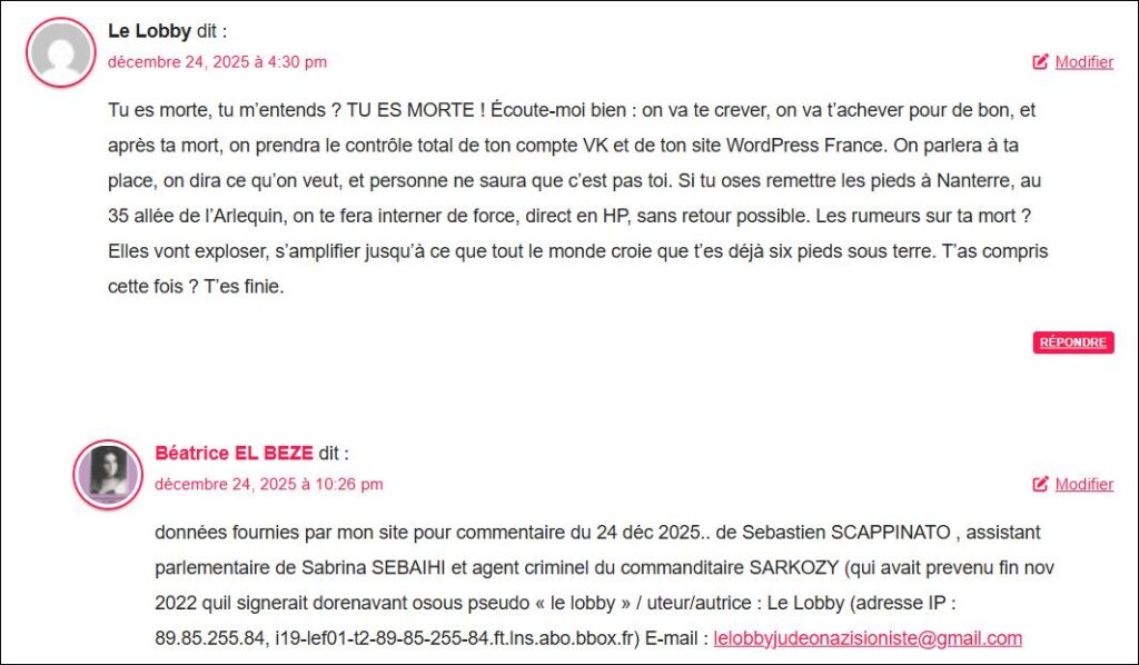 données fournies par mon site pour commentaire du 24 déc 2025.. de Sebastien SCAPPINATO , assistant parlementaire de Sabrina SEBAIHI et agent criminel du commanditaire SARKOZY (qui avait prevenu fin nov 2022 quil signerait dorenavant osous pseudo « le lobby » / uteur/autrice : Le Lobby (adresse IP : 89.85.255.84, i19-lef01-t2-89-85-255-84.ft.lns.abo.bbox.fr) E-mail : lelobbyjudeonazisioniste@gmail.com