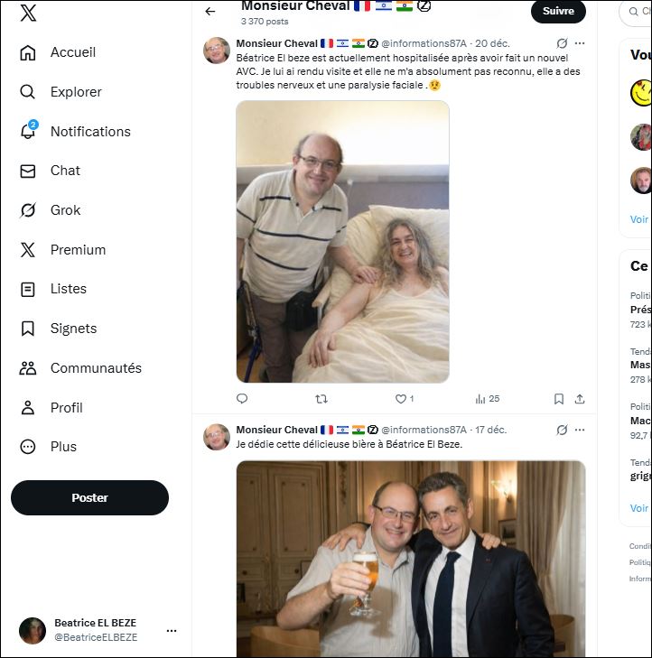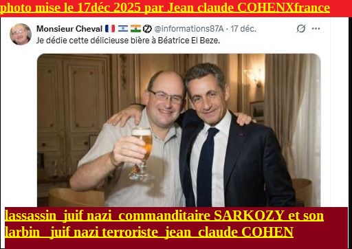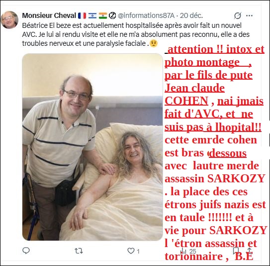 voici 2 photos extraites de la page Xfrance de jean claude COHEN alias monsieur Cheval @informations87A publiées le 17 déc et le 20 déc 2025 en train de balancer ses intox de merde sur moi (alors que: n ai fait jamais aucun AVC! et ne suis pas à l’hopital! ; cette intox (les faux en tous genres sont une partie des méthodes du fdp commanditaire SARKOZY) est relayée aussi sur le faux profil Xfrance @BeatricePELBEZE, depuis le 17 déc 2025 . L’étron i JC COHEN na pas remis son nom (avant il y était avec une grande photo de son « maitre » le taré criminel SARKOZY en image de fond , là on le voit JC COHEN sur une phito montage avec mon visage pris dans une de ems vidéos je suppose) et un autre photo vraie celle là ou il jubile, bras dessus dessous avec son « mmaaaaaaiiiiiitre » lassassin lache et cinglé sans honneur ni courage SARKOZY. Que Dieu fasse crever ces fdp criminels juifs nazis ! couverts criminellement (enquête bloquées dasn toutes mes plaintes pourtant non classées sans suite car trop de preuves ) par le procureur colalbo criminel yves BADORC TJ Nanterre (comme avant lui pascal PRACHE et Laure BECCUAU . Voir la vdiéo message de létron Claude COHEN plus bas ……..