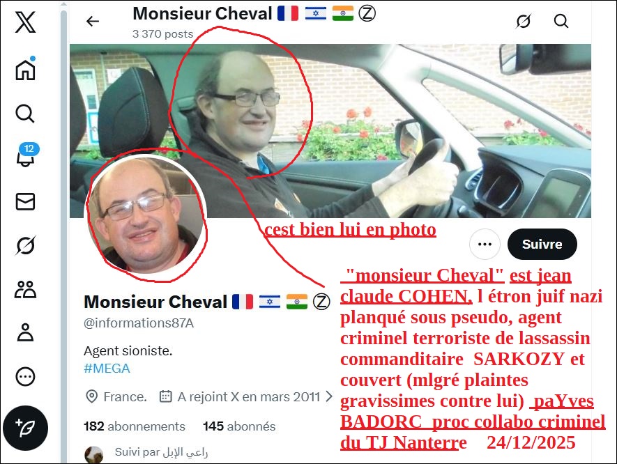 Ci dessous encore ses intox de merde du 20 déc 2025 balancées par cet étron criminel JC COHEN sur ce faux profil des agents juif nazis de SARKOZY lobby ici : Beatrice EL BEZE @BeatricePELBEZE et sur son compte Xfrance Jean Claude COHEN renommé récemment « Monsieur Cheval »,
