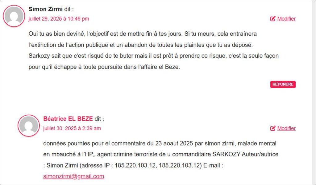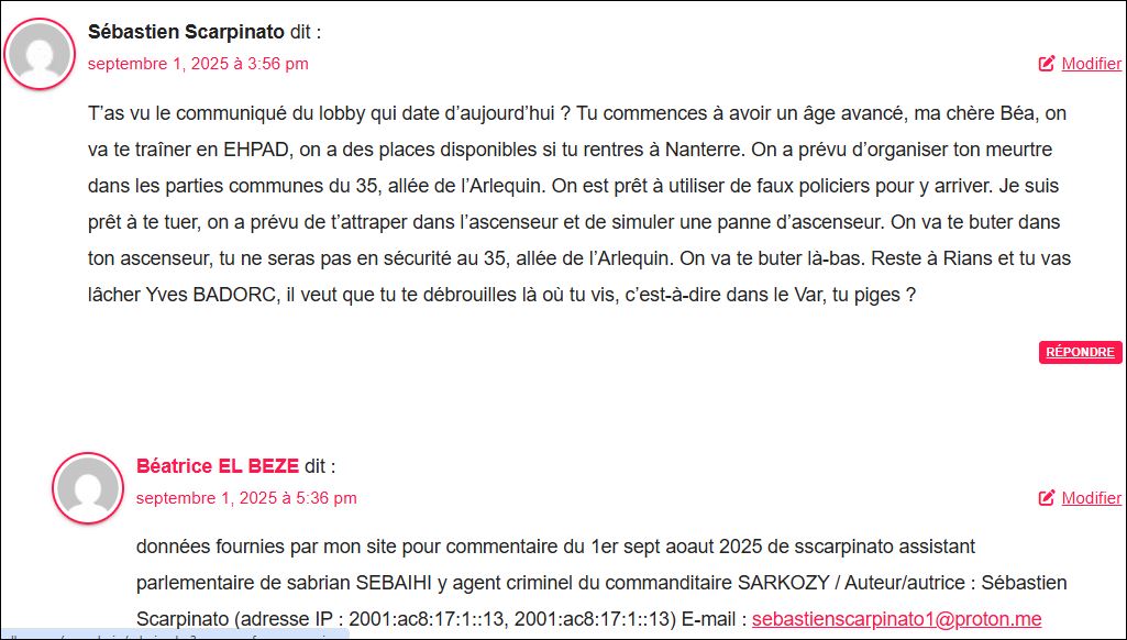 données fourniess apr mon site pour commetaire du 4 sep 2025 par sebastien scarpinao ; assistant aprlemeanire de sabrina SEBAIHI et agent criminele terroriste du commadtiaire SARKOZY / Auteur/autrice : Sébastien Scarpinato (adresse IP : 2a02:6ea0:f105:2721::17, 2a02:6ea0:f105:2721::17)