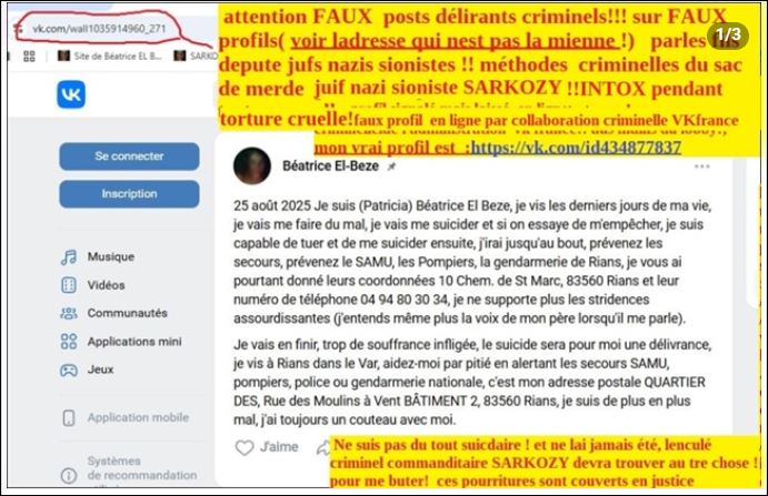 voici aussi le faux posts sur faux profil avec lequel ces agents criminels de lassassin commanditaire SARKOZY ont fait venir la gendarmerie le 28 aout 2025 là où suis refugiée ; heureusement j’ai pu montrér les faux posts sur mon ordinateur aus gendarmes et l ‘adresse du faux profil VK france site collabo criminel ) sinon jaurais pu être internée comme en 2013 uniquement avec des faux !! à nouveau via cette même pourriture SARKOZY, qui fait faire des faux et faux profils à ces vermines d’agents xeriminels impunis, toujours les mêmes et tous connus (noms à lappui, photos, adresses mails et IP etc,) du procureur Yves BADORC. Ce procureur les couvre criminellement comme le procureur pascal PRACHE avant lui malgré mes plaintes depusi des année scontre eux ;sebastien Scarpinato, cohen, fabrice de Courtenay, nicolas Godon etc , interne , toture, massacre !!! et s’imagine quil est au desssus des lois! et me fait oturer aussi pour que je ferme mon site et supprime mes plaintes. La peine de mort doit êtrer etablie pour ce gednre de v fulier (comme pour Netahanyahu aussi) . Ce fils de pute juif nazi sioniste SARKOZY doit payer pour ses crimes depuis quasi un quart de siècle dans ma persécution . Hors se question que je supprime quoi que ce soit.. Mes plaintes sont faites pour protéger ems procjes de ce déchet fou dangereus criminel . donc pluto crever que de les redne invisibles ! Je chie sur ce sac de merde criminel. (et vu lhorreur de cetteeprsécuion et sa durée cest un droit et un plaisir de l’insulter faute de ne pouvoir le buter direct!) … SARKOZY qui se donne droit de vie et de mort sur les citoyens, et de massacrer mes proches les plsu chers , a fait main basse sur tous mes biens d’une vie de travail, et toutes mes économies au prix de privations sur des années ( car petits salaires) mon logment au Maroc. prévu pour ma sécurité … et ce fou fuireux criminel simagine et a prévu en plus de me voler mes droits d’auteur (=27 ans de posésie de mon recueil dédié à mon courageux père décédé en 2013, et qui a vécu lhorreur aussi à cause de cet étron criminel SARKOZY! .- plainte est déposée contre Dan YUNES, preuves à lappui ( page 48 à 51) dans ma plainte contre SARKOZY du 24 mai 2055 …. ce sac de merde SARKOZY n’aura jamais mes poèmes comme il l’ a prévu, ni avant ni après ma mort! via sa pourriture d’agent faussaire criminel en mission Dan YUNES autre pourriture de juf nazi sioniste! .. dans mon affaire la realité dépasse la fiction .