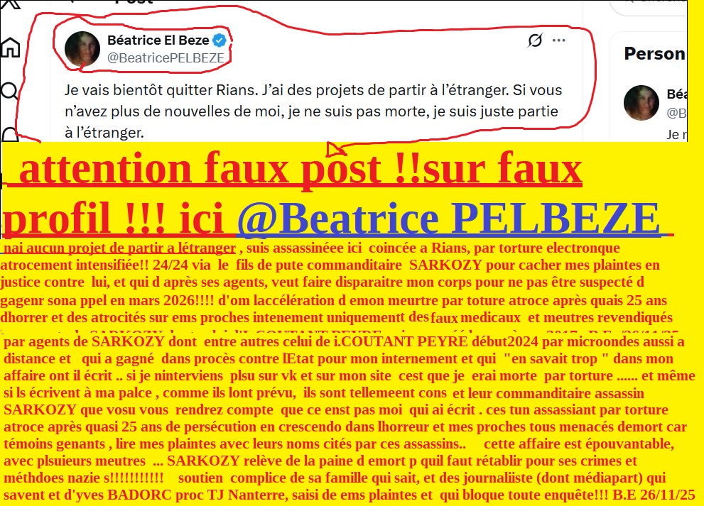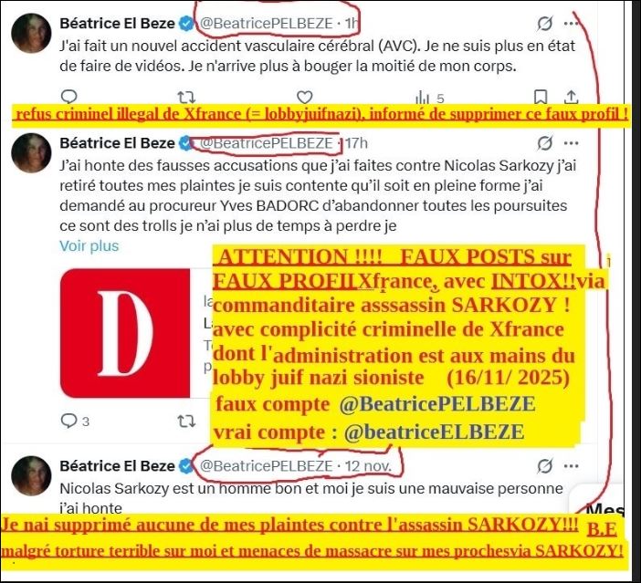 ATTENTION!! ci dessousexmples de faux posts sur ce faux profil avec usurpation de mon identité et de ma photo avatar ! (faux profil ci dessus @BeatricePELBEZE) créé en nov 2025 impossible a supprimrr jsuquà présent car X france(=,lobby juifnazi) bien qu informé à pluisuers reprises y compris par mails, refuse ILLEGALEMENT de supprimer ce faux profil. Voici des faux Posts du 5 no 2025, et ensuite sur ce faux profil avec fausses excuses et petite fiction bien déiirante et non crédible une seule seconde pour réécrire ma persécution en racontant que cest uen hoire de trolls blabla et en cachant tout ! ycompris mes plaintes terribles contre l assassin SARKOZY ! dans ma persécution étatique terrifiante débutée fin 2002 te relayée aussitot par les agents criminels du commanditaire assassin SARKOZY avec menaces de mort en boucle pour que je supprime ma plainte dès mon premier dépot de plainte : :ma plainte contre nicolas SARKOZY, du 07 oct 2021 , contre lassassin SARKOZY , lire ce FAUX POST de nov 2025, récent donc avec usurpation de mon identité e tphto avatar ci dessous !! je rappelle que lusurpation d’identité qui plus est dans affaire criminelle avec plaintes dépoées par moi, est punei dun an de prison et de 15 000 euros d’amende! et sans doute davantage en tel contexte criminel avec complcité criminelle de Xfrance.
