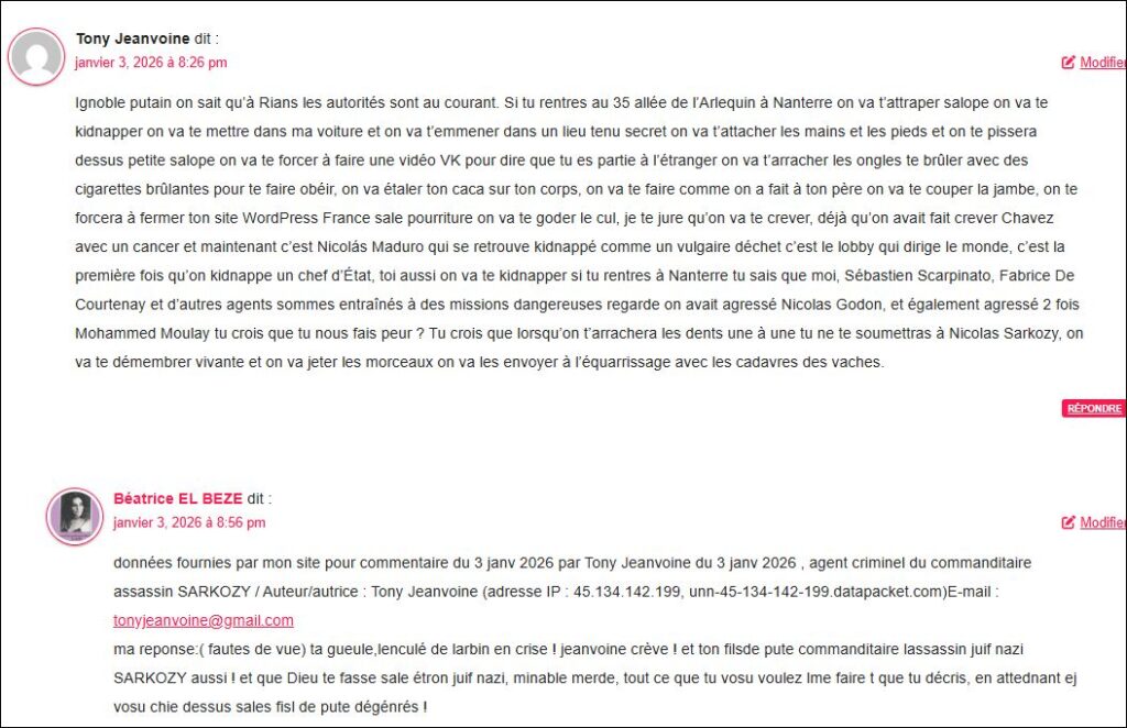 Depuis ma 1ère plainte contre l’assassin SARKOZY, de menaces de mort pusi d’ atrocités via commanditaire SARKOZY sur proches dès 2024-2025(Abdesslam AATILLAH(ma relation affective depuis 26 ans !!) déclaré « mort » le 8 mai 2025, puis en nov 2025 déclaré ‘ otage en train de crever en silence » par agents criminels de SARKOZY ! sans que puisse vérifer car il est devenu injoignable depuis sa famille aussi, menacé tous de mort ! mohammed MOULAY agressé et interné ! par qu’il voulait maider !( mon père massacré des 2007 parce suil voulait maider et fait passé pour fou avec faaux médicaux .. etc voilà les méthodes des JUIFS NAZIS !(voir liens vers mes plaintes contre SARKOZY dans le preambule plus haut )!!!!!on est bien dans lhorreur ! et la sle collaboration de l’Etat’ Police jsutice , Poste, hopitaux lDH , CSM etc) dans lhorreurde sméthodes de ce sac de merde fou dangereux JUIF NAZI, SARKOZY !!!!!!!et un terrorisme d ‘Etat multiquotidien avec torture et menaces de mort sur proches incessantes ! (voir captures dessous ce jour encore ) avec aussi faux profils ! avec faux posts( malgré signalement a Pharos depuis plsu dun moi s!!sans que phars bouge ni Xfrance en bougent ! mettant en danger ma liberté et la sécurité par venue samu pompiers ou police, poteniellement aux ordres ! pour le pire et enfin ,chassée par harcèclement criminel de mon logement social à Nanterre depuis fin juil 2024 et refugiée isolée à Rians sans pouvoir revenir chez moi car menaces de mort non stop de venue du samu criminlairé pour me réinterner avec faux médicaux comme en 2013) et véritable état de siège, seule sans voiture, isolée avec courriers interceptés,appels, sms, mails etc tous sous controle et quosi tous bloqués , impossiblité de trouver un avocat … insensé !!!! une prise d’otage o à Rians, siolée et état de siège (apepels , mails , sms messages courriers qous contrôle et bloqués )avec torture pour me faire taire et fermer mon site par lala violence des souffrances infligées( je ne cèderai pas quoi il advienne, ces plaintes étant déposées pour protéger mes proches, tous menacés de mort, avec atrocités commises sur certaisn d’entre eux/ voir mes deus lpaintes ), qu’ils se torchent avec leurs ordres ces juifs nazis et leur commanditaire assassin SARKOZY) !!!…. et pendant ce temps le procureur TJ Nanterre Yves BADORC saisi de mes plaitntes contre SARKOZY et contre ses agents terroristes bloque toute enquête (malgré preuves avec noms,adresses maisl, IP , photos) en attendant sans doute quon me crève d’une manière ou d’ ‘une autre(par toture ou autre scénario) et quon fasse taire mes proches de façon ou d’une autre!! situation et méthodes insensées d’une criminalité absolue (lire cette plainte pour atrocité sur proches, torture sur moi , chantage criminel incessant sur tous me sproches tous emancés de mort à cejour non stop!! … et en plus sui torturée à mort avec cruauté dans grandes souffrances jour et tnuit avec seances atroces intensifiée pour tenter de em faire obéir !! via commanditaire assassin SARKOZY) pour que je ferme mon site où sont publiées mes plaintes contre lui le FDP SARKOZY! et que suprrime mes plaintes contre lui; ce sont des méthdoes juives nazies via lassassin juif nazi SARKOZY avec complcité criminelle de la Justice via procureur ves BADORC ! que he déonce haut et fort ! l voir cet article : « L a persecution de lhorreur par lassassin et tortionnaire commanditaire SARKOZY :