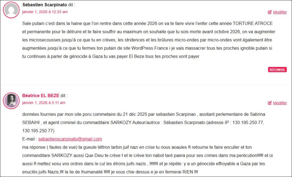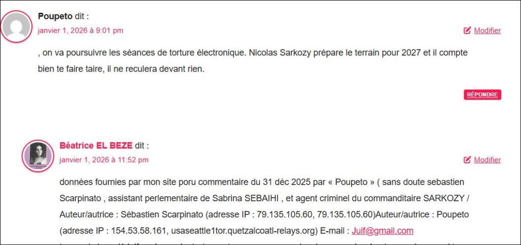 données fournies par mon site pour commentaire du 3 janv 2026 par sebastien scarpinato , assitant parleetnaire de Sabrian SEBAIHI et agent crimine de SARKOZY / Auteur/autrice : Sébastien Scarpinato (adresse IP : 79.127.141.14, unn-79-127-141-14.datapacket.com)
