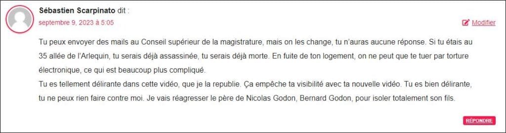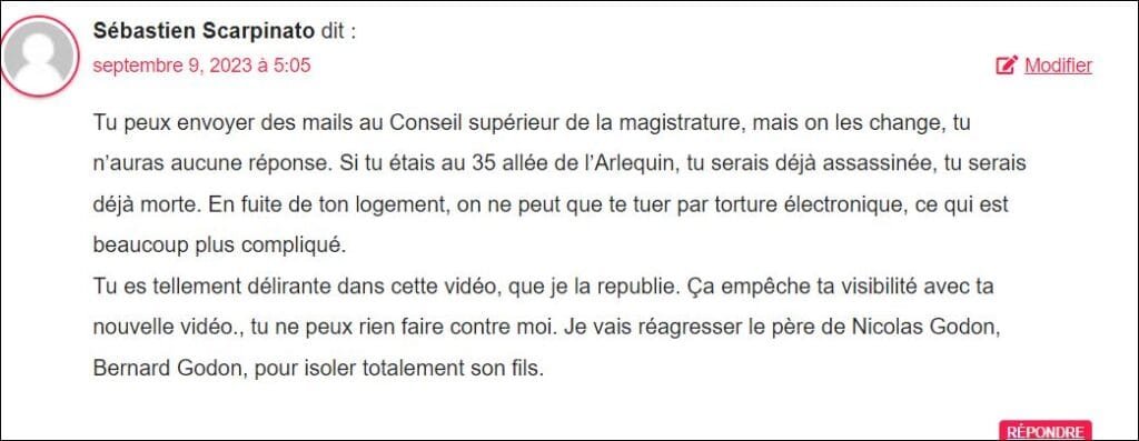 Tu peux envoyer des mails au Conseil supérieur de la magistrature, mais on les change, tu n’auras aucune réponse. Si tu étais au 35 allée de l’Arlequin, tu serais déjà assassinée, tu serais déjà morte. En fuite de ton logement, on ne peut que te tuer par torture électronique, ce qui est beaucoup plus compliqué. Tu es tellement délirante dans cette vidéo, que je la republie. Ça empêche ta visibilité avec ta nouvelle vidéo. Tu es bien délirante, tu ne peux rien faire contre moi. Je vais réagresser le père de Nicolas Godon, Bernard Godon, pour isoler totalement son fils.