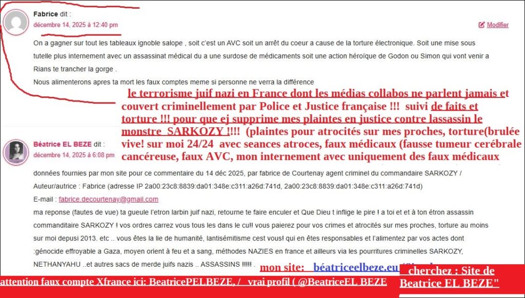 etc etc et faux pots constituant un danger pour ma liberté et ma sécurité par risque d’ embarquement pour reinternement et ou mise sous tutetlle sur la base de ces faux posts sur faux profil criminel Xfrance @beatricePELBEZE ( faux profil pourtant signalé à Pharos police judiciaire depuis le 2 déc 2025 preuve à lappui!!) !!) e suivies de faux médicauX , tenté à nouveau hier pour me réinterner , et refaire des faux médicaux psychiatriques puisque COUTANT PEYRE  » butée »= assassinée) d’après les agents de SARKOZY , il ny aplus d’obstacle ..!!!! le nabot taré ASSASSIN SARKOZY se croit tout prermis et n a plus de limites !!!!!!!!!!! et compte buter tous les témoins genants dans ma persécution , d’après ses agents , il a commencé à en détruire certains atrocement et en buter certains autres … on le voit le MONSTRE ASSASSIN SARKOZY, qui ose brailler  » je suis innocent  » à chaque fois quil est condamné, et qui massacre et torture non stop.. et qui bouffe des yaourts en prison pour maigrir et apiitoyer les juges pour gagner son appel en mars 2026 et ne surtout pas retourner en taule malgré son court sejour en taule VIP+++, et qui ne recule plus devant rien comme monstruosité et atrocités . il faut l’enfermer à vie ce monstre , et il faudrait retablir la peine de mort pour ce genre de fumier criminel comme pour Nethanyhou aussi , autre monstre juif nazi .