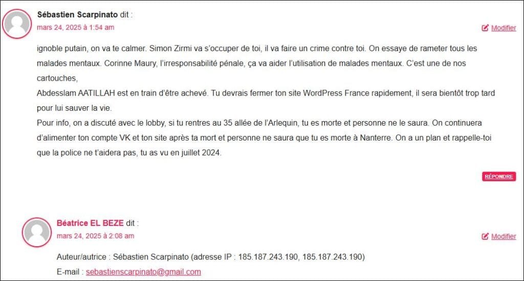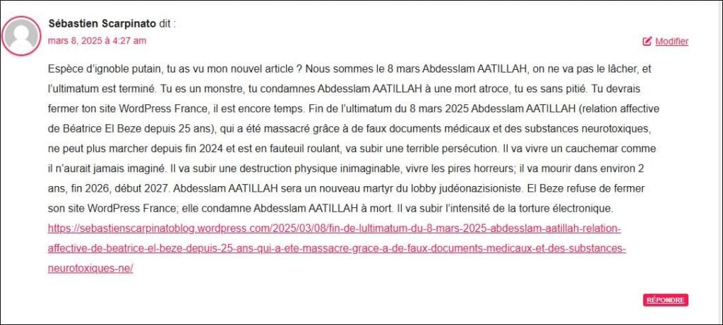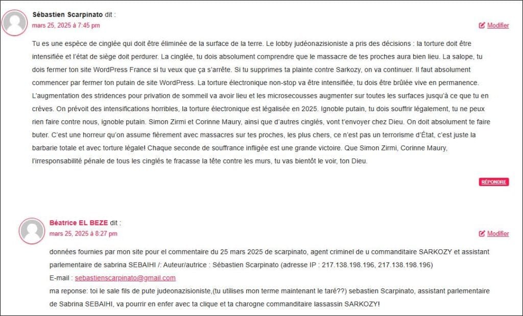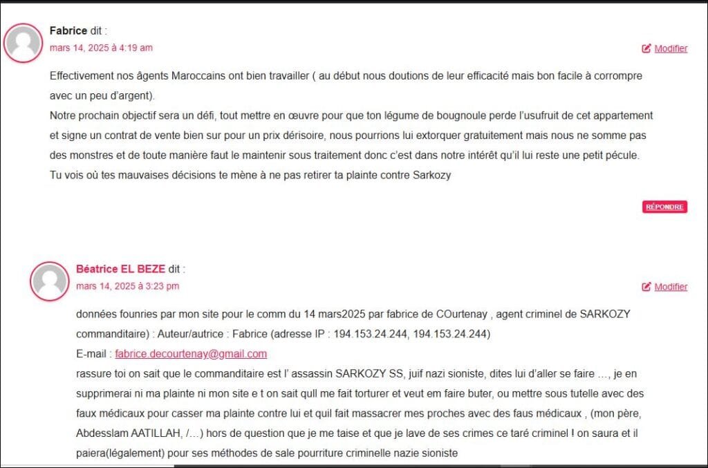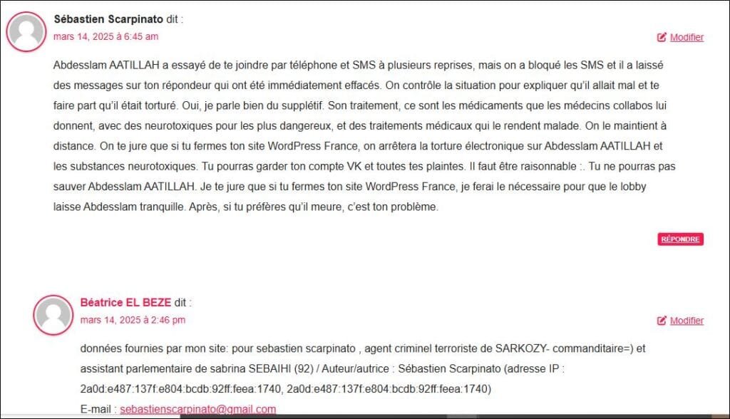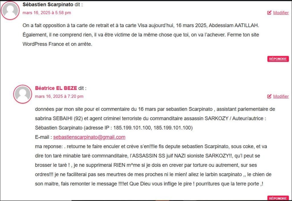 Voici un commentaire du 13 mars 2025, sorte d’aveu du lobby que je copie colle (et qui est en capture preuve aussi juste au dessous) vu sa gravité extreme, par (cliquer sur) Sebastien SCARPINATO, agent criminel terroriste de SARKOZY et assistant parlementaire de Sabrina SEBAIHI(92) : voir les donnés fournies par mon site pour commentaire (utile pour la Police) : : Auteur/autrice : Sébastien Scarpinato (adresse IP : 181.214.150.136, 181.214.150.136) E-mail : sebastienscarpinato@gmail.com URL : l (Par experiences de ces criminels, ai observé que les agents du lobby mélangent le vrai et faux pour terrorise ou manipuler mais souvent disent des vérités à la fois parce qu’ils sont très cons et se grillent, ‘ou certains sont sous coke etc) mais aussi parce qu’ils ont un tel sentiment d’impunité qu’ils disent ce qu’ils vont faire ou ce qu’ills ont fait ..: