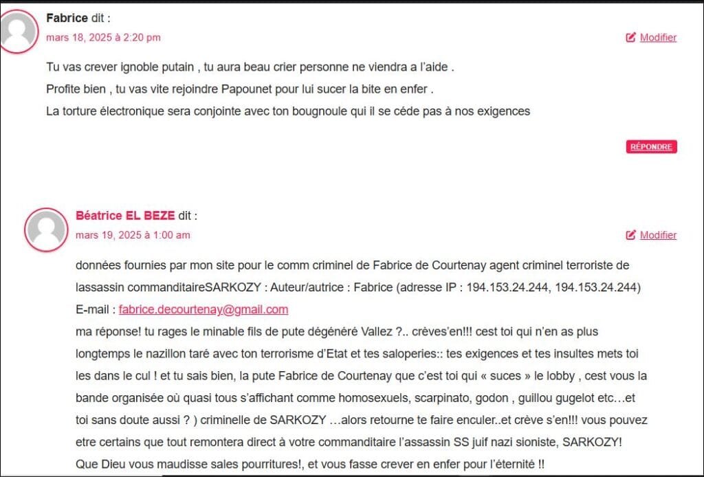 ma réponse: … ecoute bien la minable merde, fabrice de Courtenay, la bande organisée d’homoxsexuels qui s’affiche en tant que tels le scarpinato , le Godon, et les autres cest vous tous ! que ej sache ! alors cest toi qui « suces » le lobby, donc retourne aussi te faire enculer pourriture terroriste !! !et si vous le tuez je le ferai savoir sur mon site, d’autant que le supplétif si grave en justice déposé depuis le 17 sept 2024, sur vos menaces de mort sur les Aatillah et les Sanchez et moi, est toujours sans aucune enquête de la part des procureurs depuis 7 mois déjà!! qui bloquent criminellement dans cette plainte aussi toute enquête et qans ce ce supplétif ( qui n’avait pas été pas mis en public par omission, corrigée depuis ) et suivi comme par hasard un mois après de fauteuil roulant tout à coup,( avec faux médicaux et neurotoxiques a haute dose) pour Abdesslam ATILLAH,et de fausse tumeur cérébrale, tout à coup pour le petit fils Sanchez, et vos aveux en prime !,rien de difficile à comprendre chronologiquement, les procureurs sont responsables indéniablement de la poursuite monstrueuse de ces actes sur ordres de SARKOZY ! suivi de menaces de torture à mort pour Abdesslam AATILLAH depuis le 8 mars 2025 ..et de mort plus rapide:! dis tu maintenant, le sac de merde de courtenay!! ! ça se saura, croyez moi, et ce sera un aveu de plus ,car Abdeslam AATILAH na pas de maladie amenant la mort mais des menaces de mort depuis fin 2023, comme les SANCHEZ !!!( raison de mon supplétif en justice dès sept 2024 ! et moi n’ai aucune soidisant tumeur de 1, 4 com depuis avril 2022 et suis en vie sans médocs ni operation depuis 3 ans !! et ma plainte contre ces faux est là depuis mai 2022, et mon père na jmais eu d « emaladie juive génétique très rare » (diagnostic bidon par pascal RISSHMANN en 2027 a posteriori en 2007 qui serait apparue tout à coup ^dès quil a voulu maider fin 2006 !!! n’imaginez pas que vous abuserez les gens ! vous etes pressés de nous buter,Abdesslam AATILLAH et moi hein les fils de pute mais ça remontera direct au fou furieux commanditaire SARKOZY et comme mobile éclatant il y a ma plainte contre lui depuis o »oc 2021 ( quil veut que je supprime de gré ou de force !l!! votre place a tous est en taule bande de sales nazis sionistes tarés dégénérés!! et tu crois que je vais supprimer mon site et ma plainte devant de tels actes monstrueux sur tous mes proches et de telles menaces de mort pour nous achever en vitesse ! tu reves le sac de merde! et ta charogne SARKOZY aussi, je garde et et plus que jamais mon site et ma plainte contre ce fou furieux !! pas question que la charogne SARKOZY nous fasse tuer après de telles horreurs et qu’en plus on se sache rien !!! ni que je facilite nos meurtres par ce taré SS !détraqué mental SAROZY en supprimant ma plainte et mon site! et jai une puce(je le confirme) mais Abdesslam aussi dites vous, donc on est condamnés à mort au moins par torture ! Que Dieu vous inflige le pire et vous fasse crever dans les pires souffrances ! Mets toi tes ordres dans le cul, minable sac de merde !