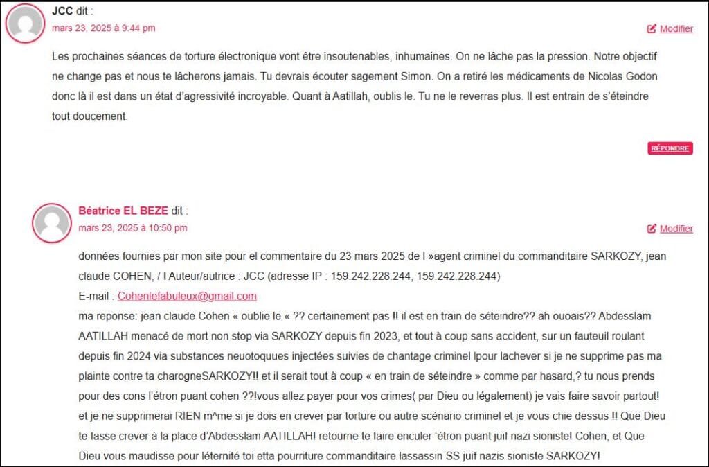 SOS !!!! chantage criminel monstrueux via SARKOZY, commanditaire assassin, par ses agents criminels couverts en justice de SARKOZY, qui disent qu’ils vont « achever »(et tuer » Abdesslam AATILLAH si je ne supprime pas (cliquer sur) ma plainte ( d’oct 2021) contre SARKOZY! / voir leurs commentaires ci dessous puisqu’ils se servent de mon site pour me faire passer les messages du lobby qui sont d’une criminalité absolue surtout quand on sait qu’Abdesslam AATILLAH menacé de mort depuis oct 2023 dans le cadre de ma persécution via SARKOZY est sur un fauteuil roulant! depuis fin 2024: (en ai eu confirmation par un membre de sa famille il y a10 jours et suis sous le choc) et il est impossible à joindre (le lobby bloque les communications, sms messages vocaux ) et en état de siège comme moi, et en pleine force de l’âge et détruit suite aux actes criminels du commanditaire SARKOZY! (lire tout l’article pour comprendre) aussi j’informe en urgence parce que cet assassin SARKOZY est capable de tout pour qu’on ne connaisse pas ma persécution étatique terrifiante et ses crimes et torture! Faites savoir je vous en prie ! autour de vous !pour empêcher la poursuite de ce crime, car n’ai aucun autre moyen d’action que mon site, et suis en état de siège, la justice et la Police, la LDH ect,..tout étant totalement aux ordres du lobby judeonazisioniste qui protège le monstre SS sioniste SARKOZY..