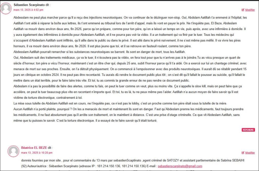 « Abdesslam ne peut plus marcher parce qu’il a reçu des injections neurotoxiques. On va continuer de le dézinguer non-stop. Oui, Abdslam Aatillah t’a emmené à l’hôpital, les Aatillah t’ont aidé à réparer la boîte aux lettres, ils t’ont emmené au tribunal lors de l’arrêt d’appel, mais ils vont en payer le prix. Ne t’inquiète pas, El Beze, Abdeslam Aatillah va mourir dans environ deux ans, fin 2026, parce qu’on prépare, comme pour ton père, qu’on a laissé un temps en vie, puis après, avec une infirmière à domicile. Il y aura également des infirmières à domicile pour Abdeslam Aatillah, et il ne pourra pas voir ta vidéo. Il a un traitement qui va finir par le tuer. Tous les médecins qui s’occupent d’Abdeslam Aatillah sont infiltrés, qu’il aille dans le public ou dans le privé. Il est allé dans le privé naïvement, il ne s’est même pas méfié. Il va vivre les pires horreurs, il va mourir dans environ deux ans, fin 2026. Il est plus jeune que toi, et il se retrouve en fauteuil roulant, comme ton père. Abdesslam Aatillah pourrait remarcher si les substances neurotoxiques se barrent. Ils sont en danger de mort, tous les Aatillah. Oui, Abdeslam suit des traitements médicaux, ça va le tuer, il n’écoutera pas ta vidéo, on fera tout pour que tu n’arrives pas à le joindre. Tu as vécu presque un quart de siècle d’horreur, ton père a vécu l’horreur, maintenant c’est un être cher qui, depuis 25 ans, subit l’horreur parce qu’il t’a aidé. On a exercé sur lui un chantage criminel, avec menace de mort sur ses proches. Ensuite, on l’a détruit physiquement. On a commencé à l’empoisonner avec des produits neurotoxiques. Il aurait dû se rétablir pendant 15 jours en clinique en octobre 2024. Il ne peut pas être recontacté. Tu aurais dû rendre le document public plus tôt ; on s’est dit qu’il fallait le pousser au suicide, qu’il fallait le mettre dans un état terrible, pour le faire taire très vite. Et toi, tu as commis la grande erreur de ne pas rendre ce document public. Abdeslam n’a pas la possibilité de faire des alertes, comme tu fais, on peut le tuer comme on veut, plus ou moins vite. Ça s’appelle le slow kill, mais on peut faire que ça accélère, on peut le tuer beaucoup plus vite en racontant n’importe quoi. Et toi, tu es là, tu ne peux même pas l’aider. Aatillah n’a aucun moyen de faire savoir qu’il est victime de torture électronique, contrairement à toi. La mise sous tutelle de Abdslam Aatillah est en cours, ne t’inquiète pas, ce n’est pas le lobby, c’est un proche comme ton père était sous la tutelle de ta mère. Aucun Aatillah n’a porté plainte, pourquoi ? On les a menacés de mort et maintenant ils sont en danger. Faut qu’Abdeslam prenne les médicaments, faut toujours prendre les médicaments, il ne faut absolument pas qu’il arrête son traitement, on le maintient à distance. C’est une prise d’otage criminelle. Ce que vit Abdeslam Aatillah, sans même que tu puisses le savoir. C’est la torture électronique. Il a essayé de te faire savoir qu’il était torturé. » (capture preuve sur mon site ci dessous avec adresse IP de la pourriture scarpinato )