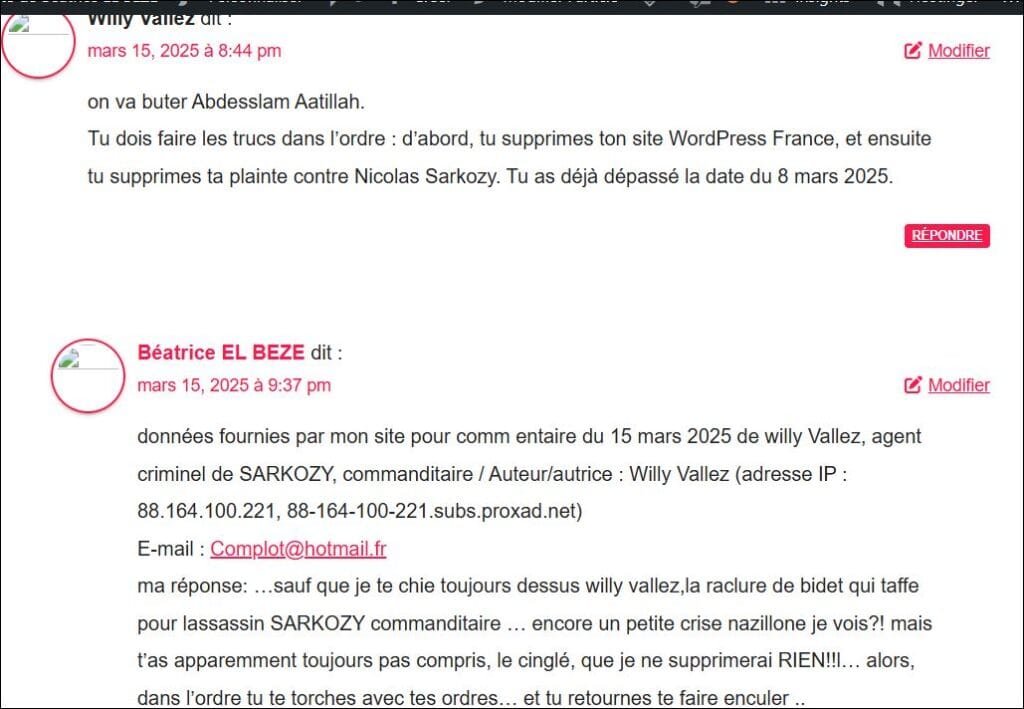 données fournies par mon site pour comm entaire du 15 mars 2025 de willy Vallez, agent criminel de SARKOZY, commanditaire / Auteur/autrice : Willy Vallez (adresse IP : 88.164.100.221, 88-164-100-221.subs.proxad.net)