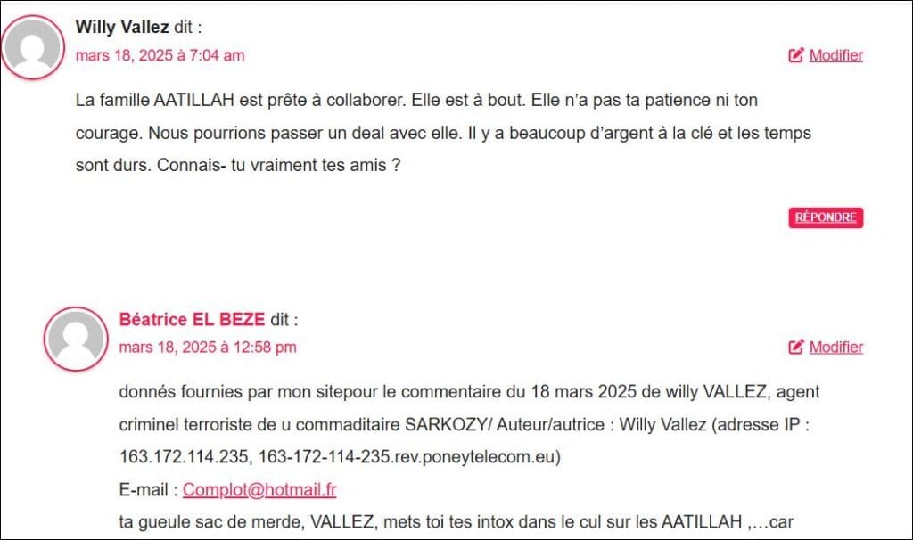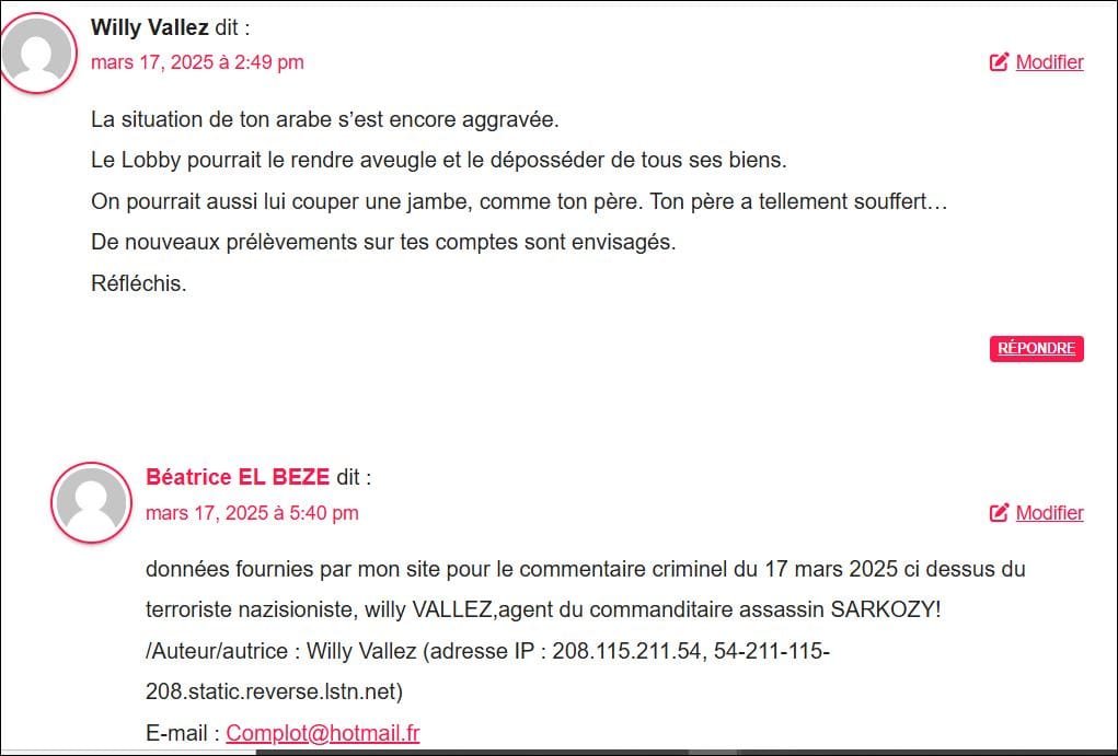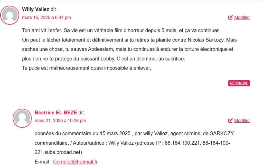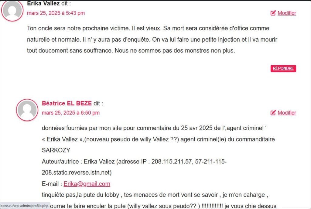 données fournies par mon site pour commentaire du 25 avr 2025 de l’,agent criminel ‘ « Erika Vallez »,(nouveau pseudo de willy Vallez ??) agent criminel(le) du commanditaire SARKOZY