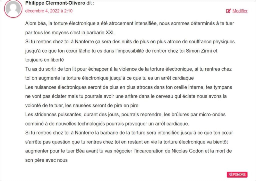1. je cite l’agent criminel du lobby « Philippe Clermont Olivero »( possiblemnt c est S.Colombo planqué derrière ) ce jour 4 déc 2022 : « .. la torture électronique a été atrocement intensifiée, nous sommes déterminés à te tuer par tous les moyens c’est la barbarie XXL(..) la torture électronique va bientôt augmenter pour te tuer Béa avant tu vas négocier l’incarceration de Nicolas Godon et la mort de son père avec nous »………. ..dans tes réves, le cinglé criminel! . avant tu vas aller te faire ….. et tu diras à ton boss que je ne négocie pas avec des tarés criminels, que ce soit lui ou vous..je les dénonce et porte plainte comme je l’ai fait . Et si je meurs par arrêt cardiaque ou autrement au terme d’atroces souffrances comme infligées durant des heures depuis quelques jours, tout le monde saura que c’est par torture électronique très intensifiée et sur probables consignes du fou criminel SARKOZY aux manettes dès 2022 et du lobbyjudéonazisioniste derrière , dans ma persécution étatique criminelle ,terrifiante.