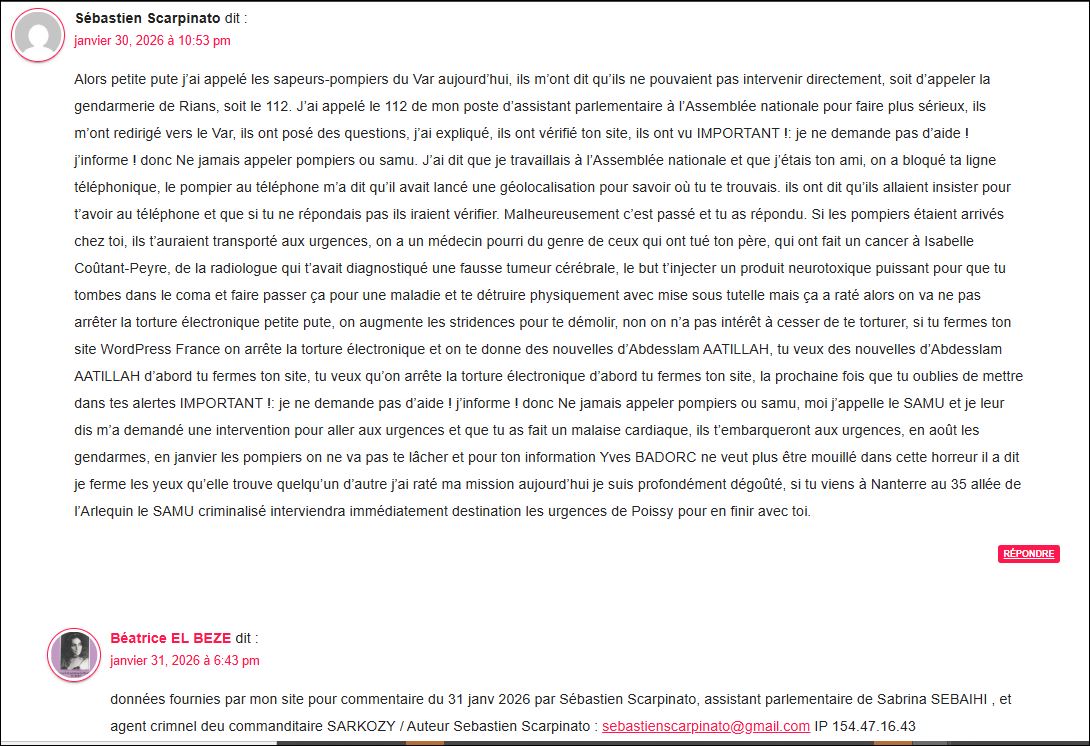 données fournies par mon site sur commetaire du 6 fév 2026 , a apr sebastien Scarpinato, assistant parlementaire de sabrian SEBAIHI et agent criminel deu commanditaire SARKOZ Auteur/autrice : Sébastien Scarpinato (adresse IP : 45.83.220.212, 45.83.220.212)