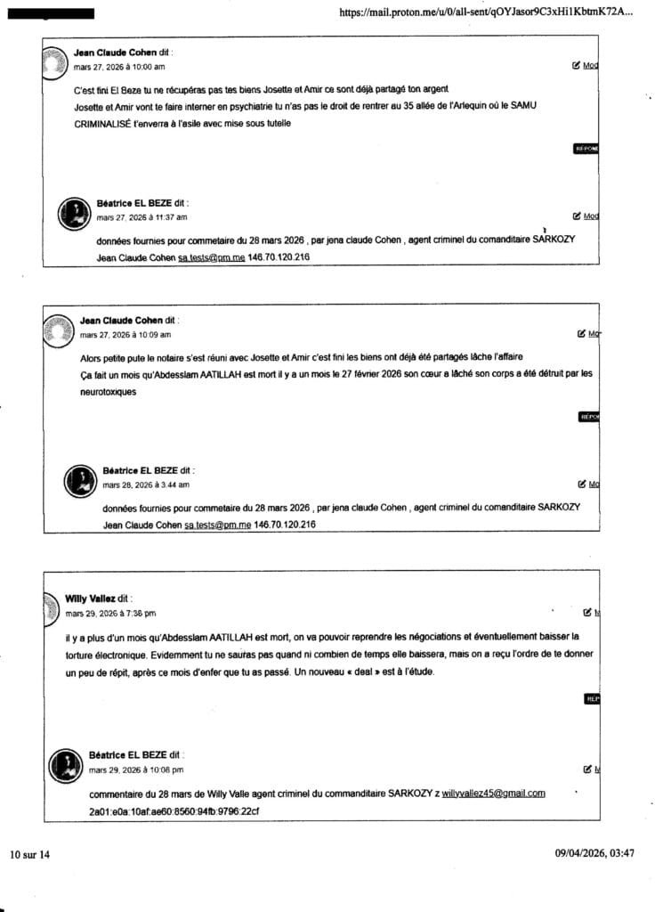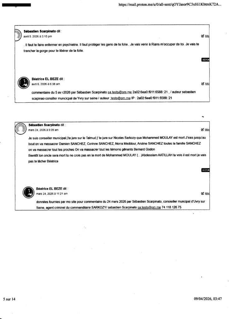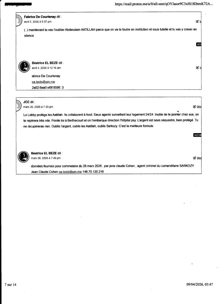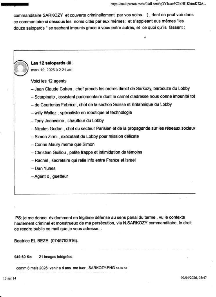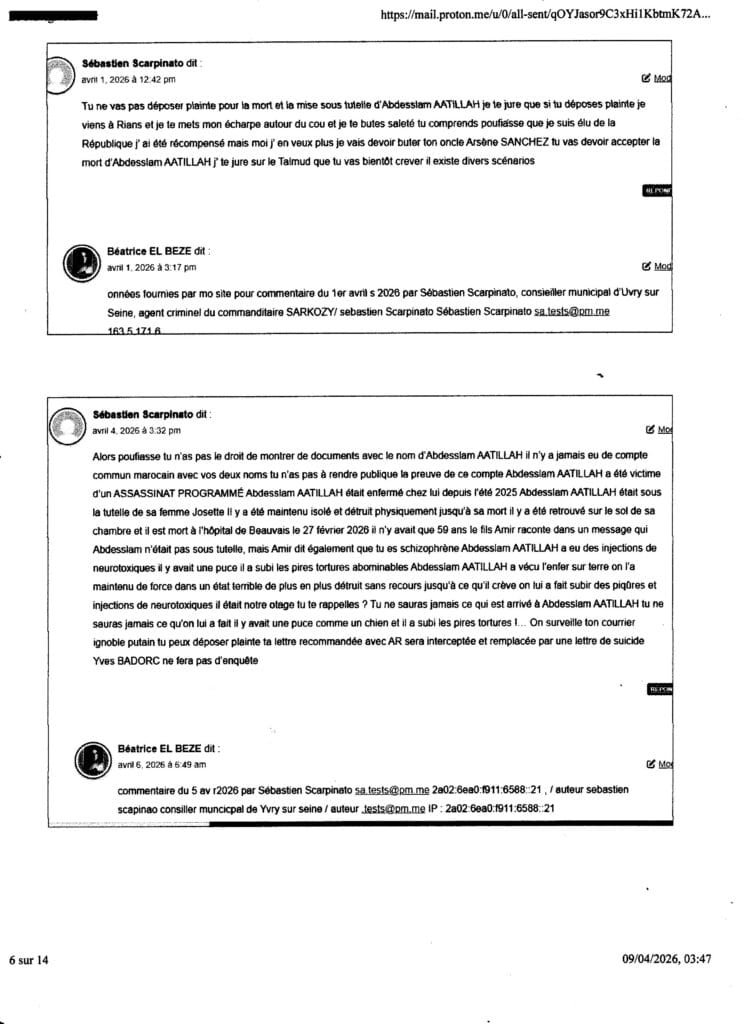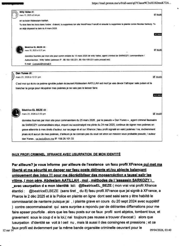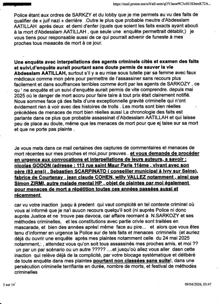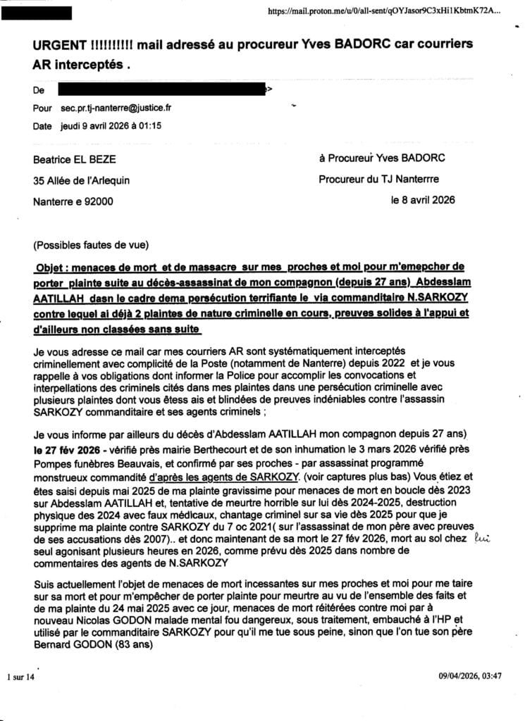 ai du madresser au procureur yves Badorc TJ Nanterre par mail car mes courriers sont tous interceptés ( plaintes courriers AR, requêtes frauduleusement et criminellement interceptées systématiquement avec complcité de la Poste (notament de Nanterre) sur consignes de l’assassin SARKOZY ……de plus ce mail étant imprimé et n’ayant pas échoué dans son envoi cette nuit, vous avez la preuve de son envoi (ai caché volontairement l’ adresse mail utilisée) ce mail me servira contre le procureur yves BADORC s’il arrive quoi que ce soit à mes proches! ou amoi ( qul met tous en danger du pire sciemment en bloquant toute enquête et en tratant pas mes plaintes et en couvrant sciemment la bande orgnisée de terroristes crimnelle citées de l’assassin SARKOZY!) – , au cas où iBADORC aura continué de cacher criminellement mes plaintes et courriers et de bloquer toute enquête pour nous laisser en danger du pire,mes proches et moi sans aucun recours comme il l’a fait pour Abdesslam ATTILLAH malgré (cliquer sur) ma plainte contre SARKOZY du 24 mai 2025; Voir dans cet article Lassassinat d’Abdesslam AATTILAH, mort le 27 fév 2026, via le commanditaire au terme de deux ans et demi de calvaire