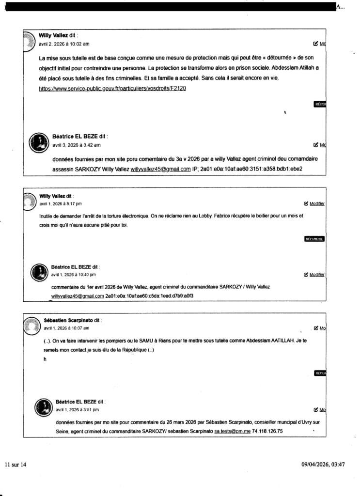IMPORTANT !!! résumé des faits avec incertitude après ma plainte de mai 2025: Lisez attentivement malgré fautes de vue) car les faits (détaillésdans article) sont atroces ! . (javais envoyé un mail public graveme t accusatoire au procureur Yves BADORC (TJ Nanterre) le 23 janv 2026,mais au lieu de délivrer une enquête en urgence!! comme par hasard Abdesslam est mort un mois après !le 27 fév 2026.! .. comme si SARKOZY le commanditaire assassin juif nazi, avait accéleré sa mort pour cacher le criminel et couvrir toutes les complicités cimplinelles.. Il parait aussi d’après agents de SARKOZY ( voir capres dans le mailà BADORC ) que ce procureur BADORC d’après les agents de SARKOZY me fera réinterner (malgré un internment uniquement avec des faux médicaux via SARKOZY en 2013 et gagné contre l’ETAT (voir docs preuves en bas et article sur la mort revendiquée par agents de SARKOZY de l’lavocate Coutant PEYRE plus bas qui a dénoncé « une production de faux à tous niveaux » dans mon internement ) donc réinternée si je porte plainte pour lassassianat d’Abdesslam AATILLAH (mon compagnon et mon amour depuis 27 ans!).. En effet ce procureur criminel Yves BADORC(du TJ Nanterre bloque criminellement et systematiquement toute en quête dans mes plaintes ( pourtant non classées sans suite !) et n’informe pas la police pour interpellations et cela pour couvrir SARKOZY et ses agents criminels. i y a donc complicité établie de BADORC et ici associations de malftaireurs.Ce procureur BADORC est donc responble à part égales avec SARKOZY commanditaire, de lassassinatt d’Abdesslam AATILLAH(mon compagnon depusi 27 ans),a été facilité et rendu possible par ce manquement grave et délibéré de BADORC à ses devoirs de procureur , car si lenquête de ma plainte terrible du 24 mai 2023 contre SARKOZY assassin commanditaire, navait pas été bloqué criminellement lenquête dans ma pliante (qui portait sur les menaces de mort dès fin 2023 via SARKOZY commanditaire, contre Abdesslam et la tentative de meurtre contre lui atroce dès 2024 par destruction physique avec faux médicaux (et fauteuil roulant dès otc 2024 jusqu’a 2025 où il pu remarcher en avril 2025 grace a mes alertes dès que jai appris en mars 2025 son état et ai fait passer le message qu’il d’arrete en urgence tout traitement médical (car criminel par neurotoxiques) et sur le chantage criminel en 2025 sur sa vie pour que je supprime ma plainte d’oct 2021 contre SARKOZY(sur lassassiantt de mon père avec les mmemes méthodes). Si cette enquête n’avait pas été bloquée, Abdel qui avait pu fuir au Maroc le 2 mai 2025, sur ses jamabes , des témoins lont vu au maroc) et remarchait, n’aurait pas pu être mis sous tutelle de sa femme Josette qui savait tout (et dont il voulait divorcer dès le 2 mai 2025 avant de partir au maroc)) mise sous tutelle de sa femme sur instigation de lassassin SARKOZY commanditaire comme fait pour on père en 2007) et redétruit atrocment et dans grandes souffrances assassiné aux neurotoxiques (dans nourriture(= empoisonnement ) puis par injectionsz et nouveaux faus médicaux) et remis sur fauteuil roulant et prisonnier et isolé chez lui sans recours (avec donc complicté criminelle de sa famille, en tout cas de sa femme (???? !!!) comme lécrivent les agents de SARKOZY jusqu à sa mort au sol dans s chambre seul agonisant durant plusieurs heures et mort a hopital 2 jours après mise dans coma artificel interrompu sur ordres de qui??) , le 27 fév 2026. Seule une plainte contre lassassin commanditaire SARKOZY pour meurtre commandité dès fin 2023, pourra et devrait via une enquête établir les faits ,notamment ce pont crucila de savoir sil y a eu ou pas mise sous tutelle! car mise sous tutelle criminelle alors (à 58 ans! tout à coup alors qu’Abdesslam nétait pas fou mais très intelligent !) pour le contraindre a la poursuite de soins médicaux criminel via SARKOZY et lempecher de fuir par neurotoxiques dans grandes souffrances physques ! ( remis très vite sur fauteuil roulant chez lui) et le faire taire (avec complicité familiale alors?? car la chronologie prouve quil y a eu tentative de meurtre dès 2024 (dénoncée preuves à lappui dans ma plainte du 24 mai 2025 plainte dont était saisi BADORC!) puis meurtre réitéré via le juif nazi SARKOZY après ed épart d ‘abdesslam au maroc le 2 mai 2026. ( ..et qu’il y a eu et qu’il y a sale collaboration des AATILLAH, notamment Josette, sa femme (dont Abdesslam dès mai 2025 avant son départ au Maroc, ) voulait divorcer!) et de son fils Amir (plus de 30 ans ) qui à cejour me volent sciemment tous mes biens que javais confiés à Abdesslam – face aux menaces de mise sous tuetelle avec des faux médicaux via lassassin SARKOZY commaditaire – et retrouvés tous dans sa chambre après sa mort parail il, à savoir les documents de mon logment acheté avec mon argent par Abdel a ma demnde au Maroc, pour ma sécurité, toutes mes économies et toous mes bijoux de valeur (valeur totale de ems biens au moins 120 000 euros) .Si les faits se sont passés tels que lécrivent les agents de SARKOZY par mise sous tutelle de sa femme ( incitée par médecins cirminels colabos via SARKOZY) et acceptée (criminellement alors!) par sa femme Josette – qui savait tout par mes message incessants et et le lien de mon site envooyé sur whatsapp souvent sur numéro d’Abdel dont elle avait le portable depuis le 2 mai 2025 jusquà la mort d’ Abdesslam ans que je le sache, sas reponse je ens avais pas si je parlais à Abdel) )) ces faits seraient alors atroces en tout cas relèvent d une enqûete criminelle pour meurtre !!!!!! IMPRTANT Depuis ma plainte du 24 mai 2025 , je nai plus réussi a avoir aucune nouvelle d’Abdesslam (sa femme et son fils et son frère Said refusant de me répondre malgré mon angoisse extrême même pour me dire si Abdel était vivant ou mort!..), donc les faits de mise tutelle de sa fe